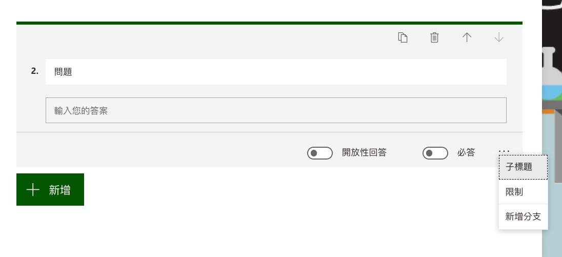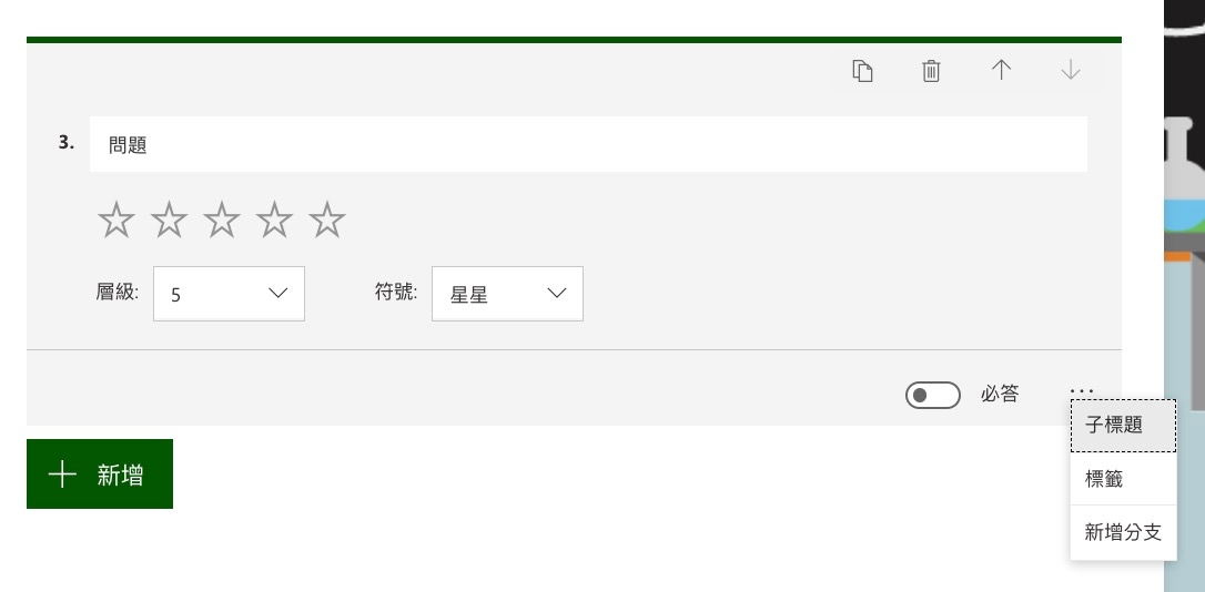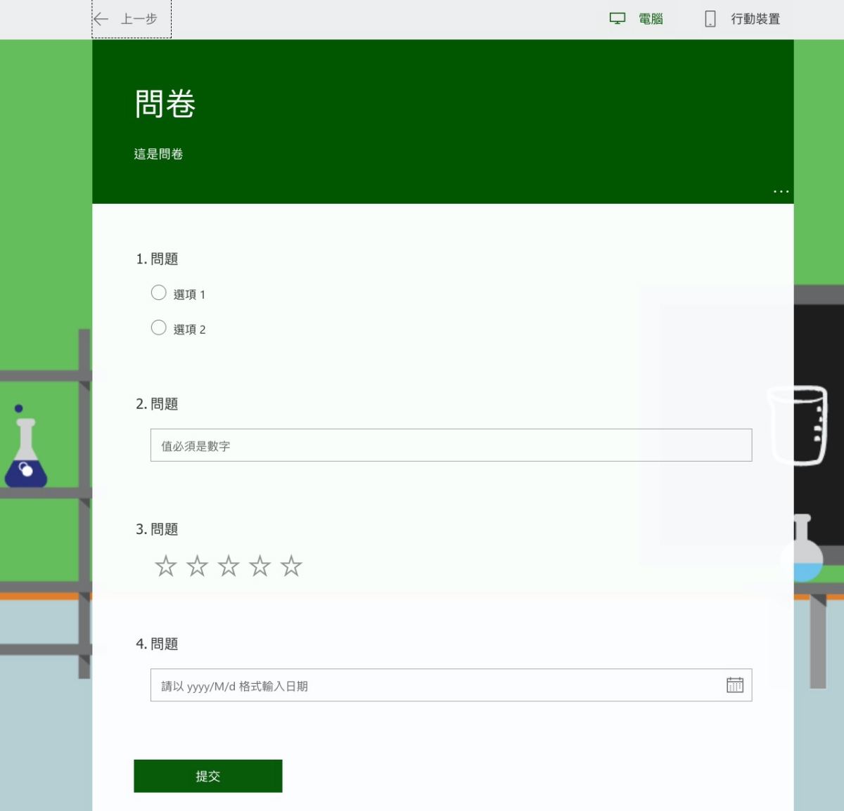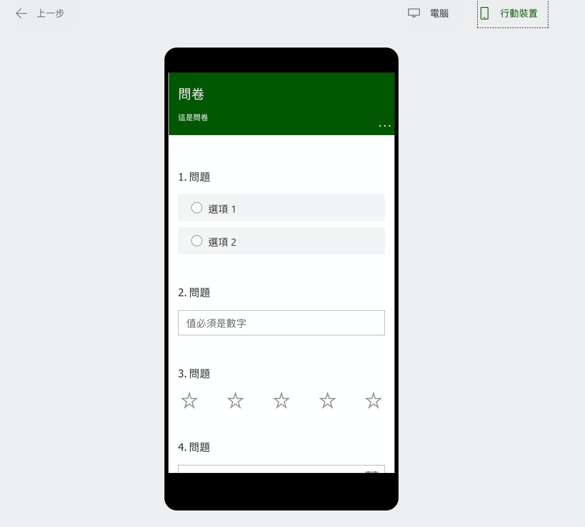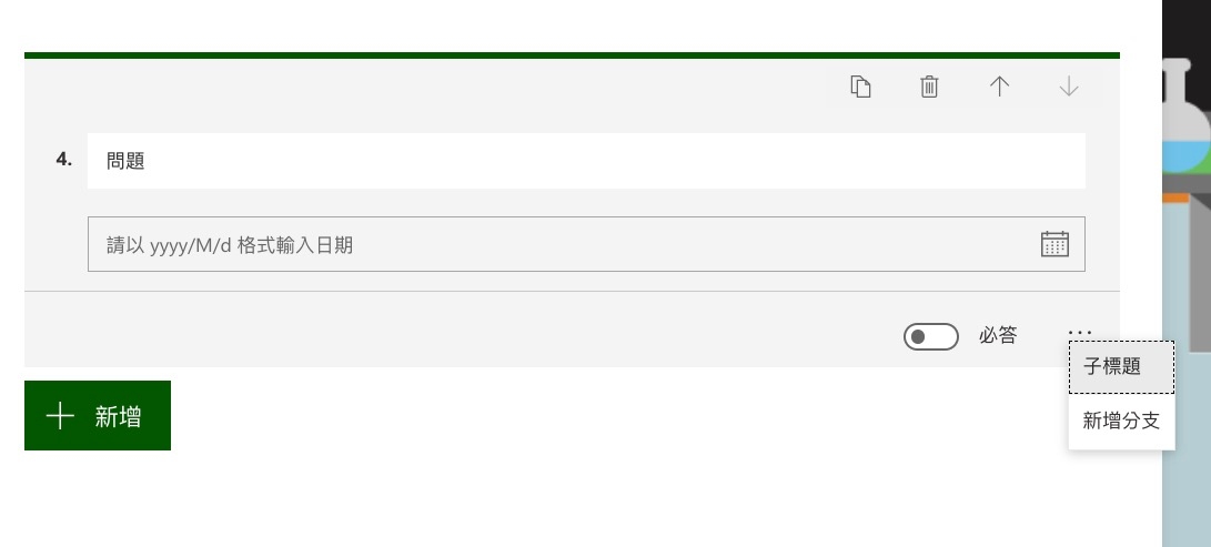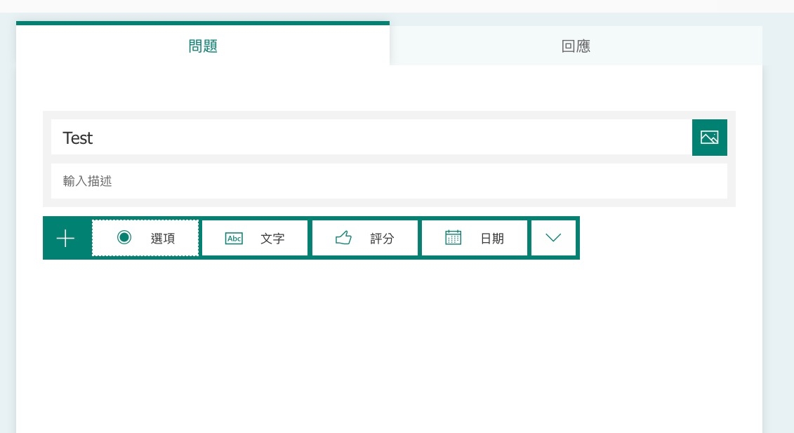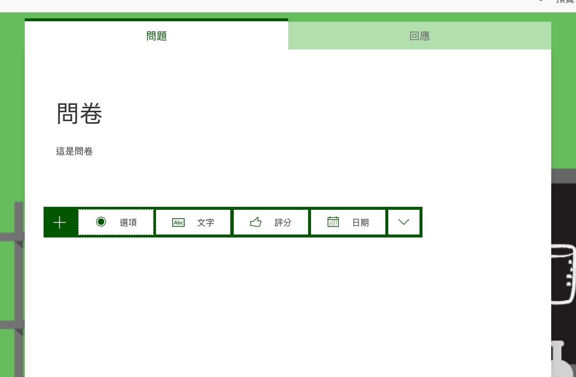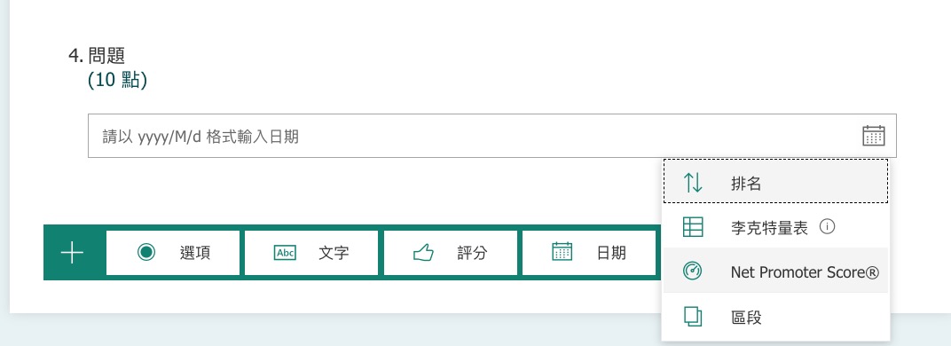 問卷跟測驗一樣,主要有四種可以選擇使用,分別是選項、文字、評分跟日期。