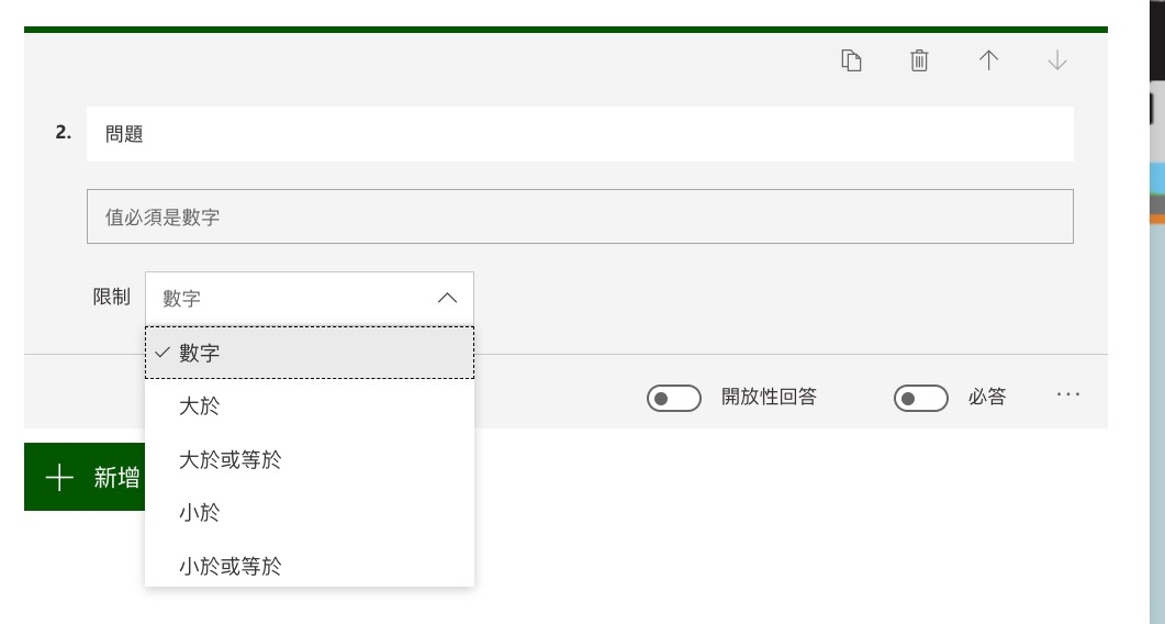 文字的部份就是指單一答案欄位,如果不選擇開放性回答也可以設定相關限制。