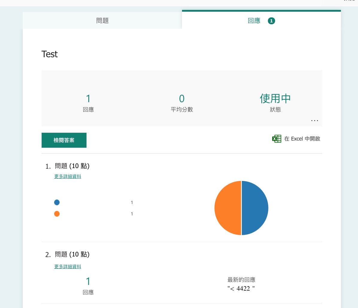 後台也可以看看目前的回應數以及答案等,當然也可以在 Excel 裡開啟查看,點擊後會下載為 xlsx 的 Excel 檔案。