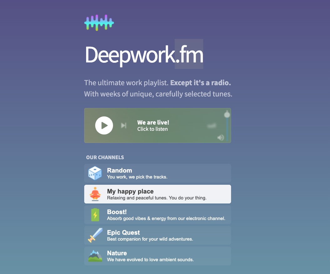 首頁 › 線上工具/服務 › 工作想專心一點聽不了有「歌詞」的音樂,那就來試試 Deepwork.fm 吧 工作想專心一點聽不了有「歌詞」的音樂,那就來試試 Deepwork.fm 吧 發佈日期:2020/10/26 作者:阿湯 分類:線上工具/服務 阿湯在工作狀態下鮮少會聽音樂,特別是有「歌詞」的,因為會不自覺想要跟著唱,所以如果想專心工作我通常會聽古典樂類的,或是一些比較放鬆的音樂,最近就發現了一個線上音樂電台叫做 Deepwork.fm,裡面完全不用選什麼,就是直接播放就可以開始工作,如果你跟我一樣工作只能聽這類音樂,那麼就來試看看我最近在聽的這電台吧。 Deepwork.fm 線上音樂電台 網站:https://deepwork.fm/ 進入網站後直接按播放就可以了,如果你想要選類別的話,往下就可以選擇,或者直接 Random 隨機播放也可以,這我想就不用多介紹了,去試看看吧。