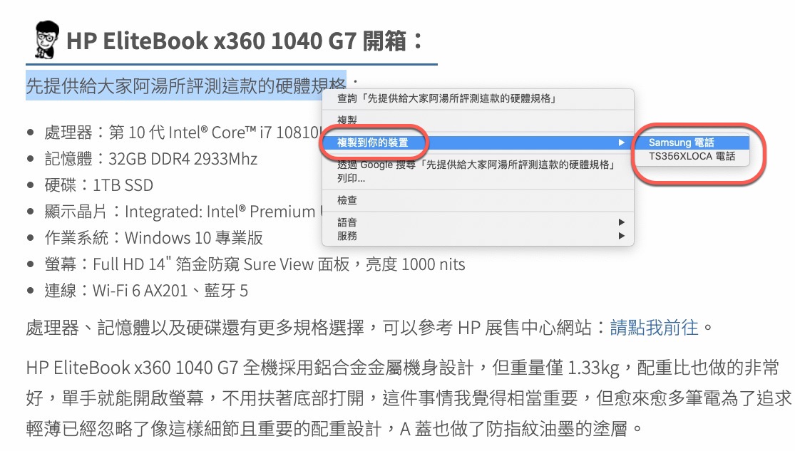 接下來就可以在任意網頁中選取文字後右鍵,就會多一個「複製到你的裝置」,然後再選擇要傳送的裝置,如果沒看到你想傳送的裝置,比如以手機為例,你可以重開啟,或是將手機上的 Chrome 從多工裡移除後重新執行 Chorme,應該就可以看到了。