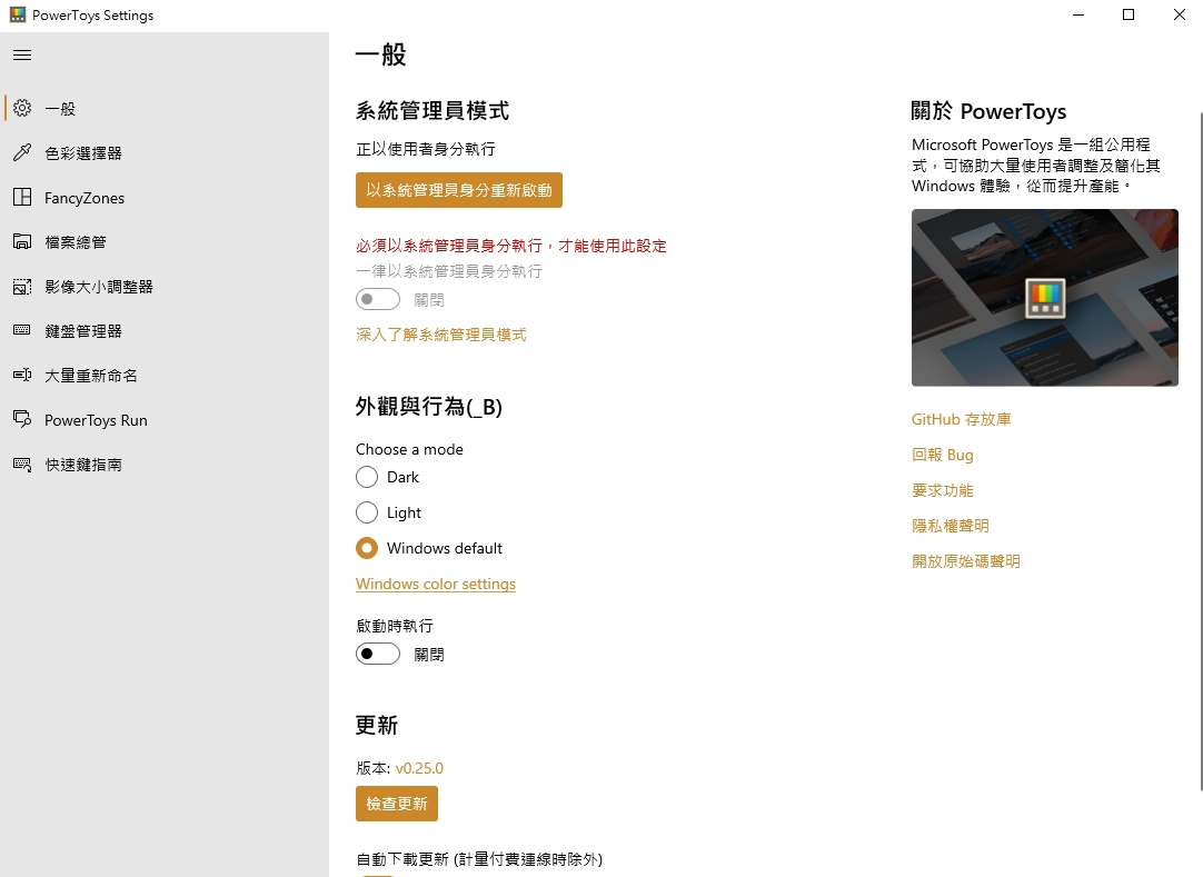 在一般裡還可以設定外觀,如果你有要使用 FancyZones 跟影像大小調整器等,建議可以勾選「啟動時執行」。