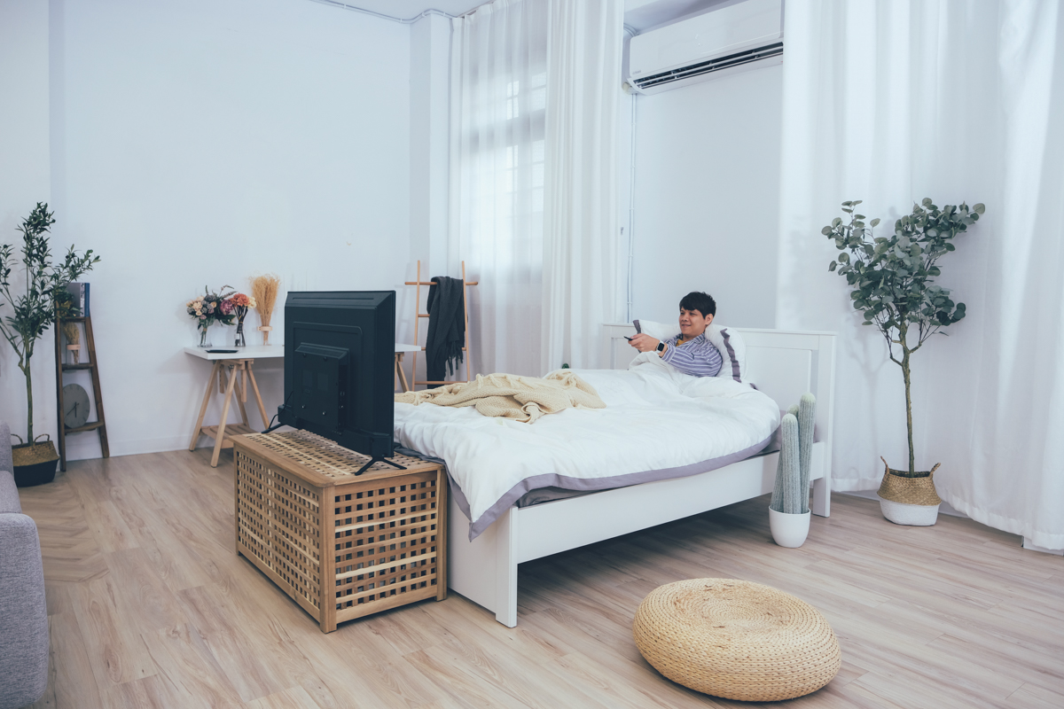 如果是以 7~8 坪左右的小套房來說,像阿湯這樣的擺放是沒什麼問題的,你可以擺在沙發跟床的中間來使用,像這樣沙發跟顯示器距離大約是 1.5 公左右,看 43 吋的距離算是適中。
