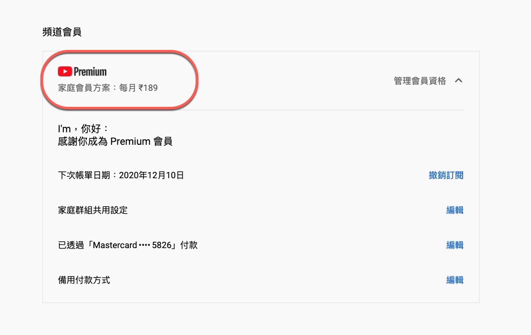 購買完後就會看到你的頁面上是顯示每月 189 盧比了,即便你把 VPN 關掉回到台灣,一樣顯示這價格。