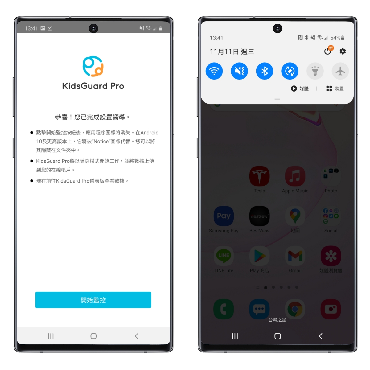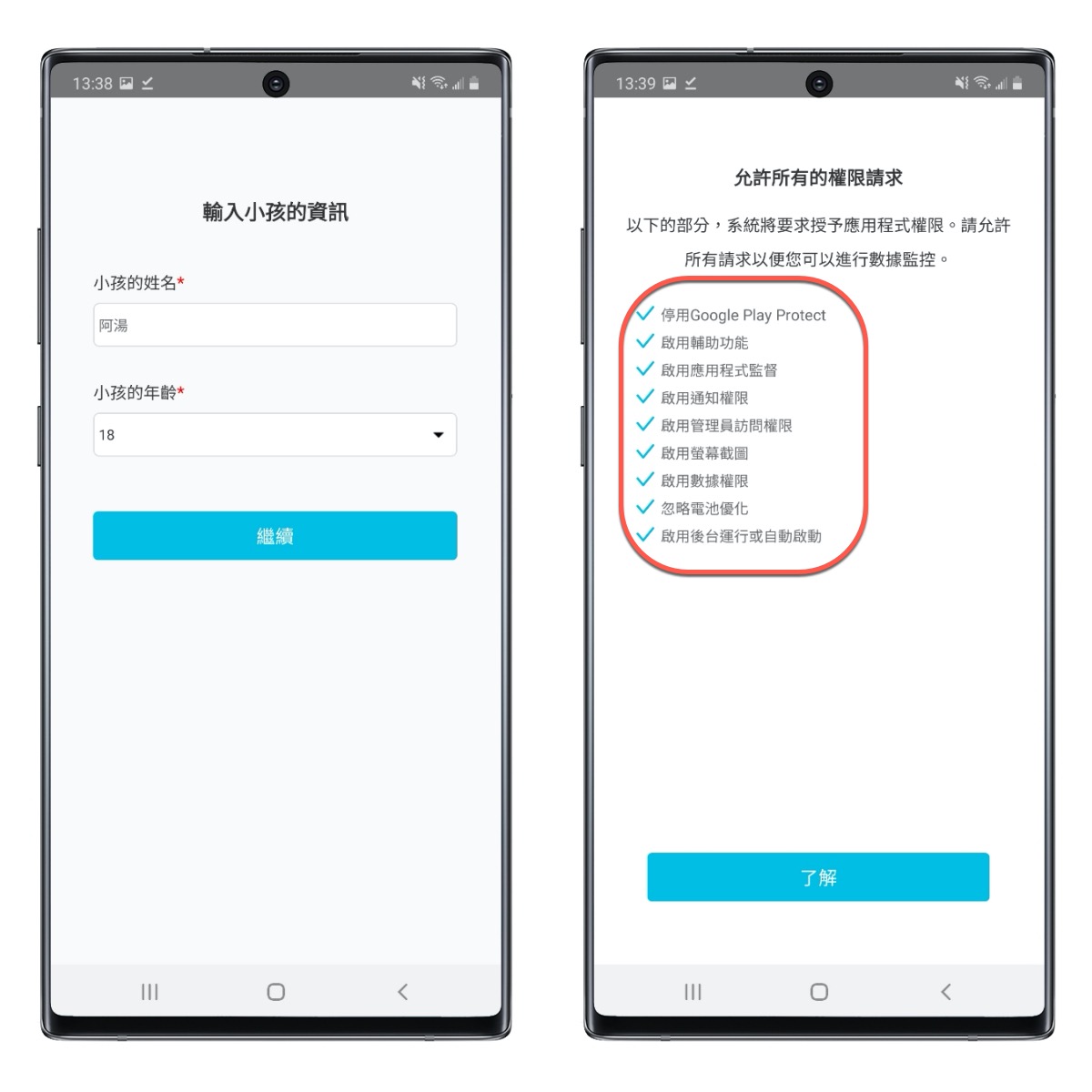 安裝成功後,重點就在於「權限」,當你在這畫面往下後,會一直要你打開各種權限,請依照 APP 上的安裝指引走,所有權限都要打開才能進行監控,我想大家可以理解吧,不提供權限的話是要怎麼監控。