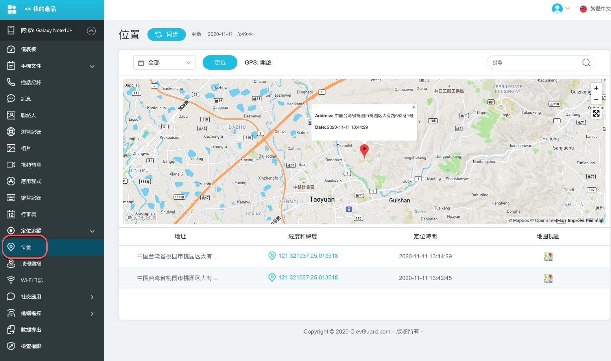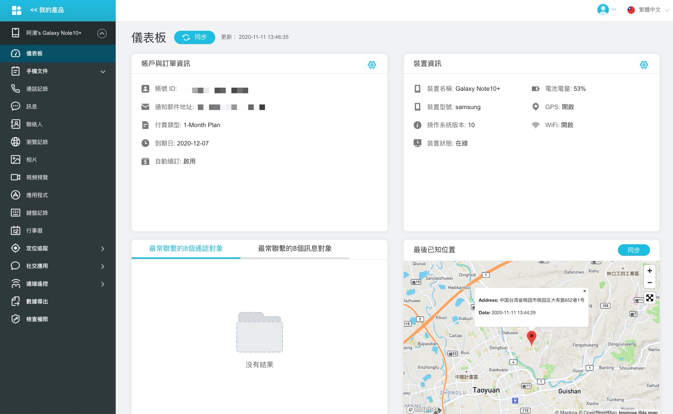 進入儀表板你會發現另一片天地啊,左側選單就是所有可以監控的部份,包括手機的檔案、通話記錄、訊息、瀏覽記錄、相片、瀏覽的影片、應用程式、打過的字、社交應用(包括 LINE、FB Messenger、Whatsapp 等),還可以遠端使用對方的手機拍一張照片下來確認畫面,非常的驚人,包括對方的地理位置也都能隨時掌握。