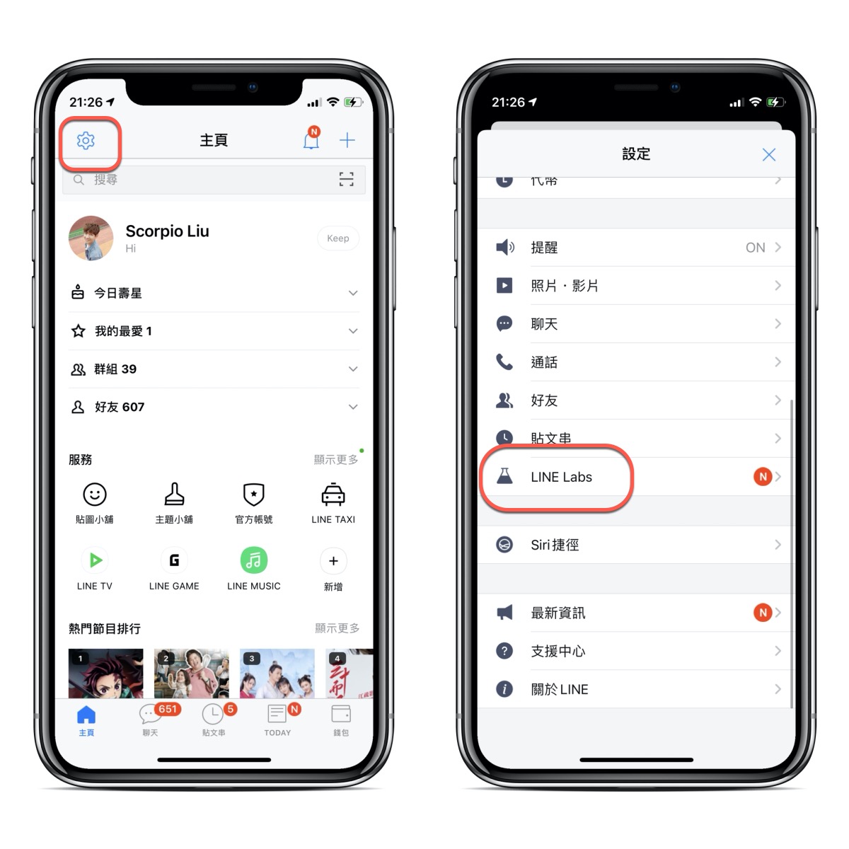 首先在主頁左上角進入設定,然後再進入「LINE LABS」實驗室功能。