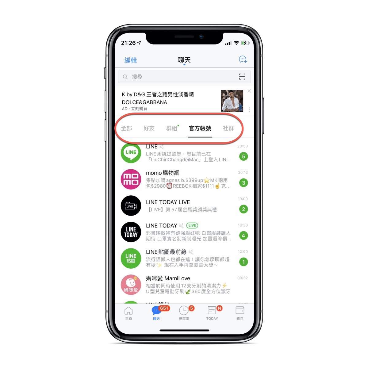接下來回到聊天訊息列表,上方就可以看到有分類了,你就可以依想看的分類去點擊查看,像平常最亂的官方帳號就不會再干擾你的視線,這功能早該推出的,還放什麼實驗功能...