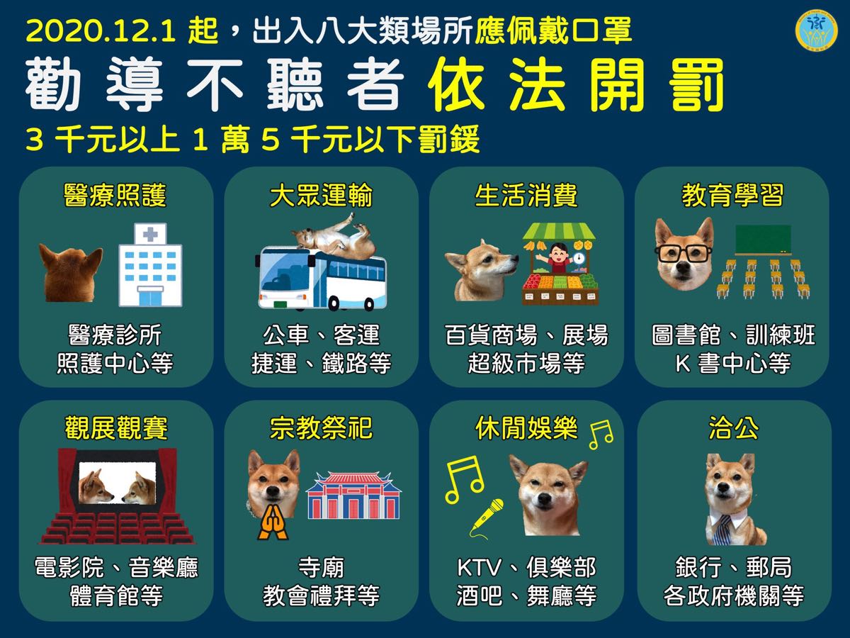 雖然台灣的 COVID-19 防疫算是相當的不錯,但進入秋冬全球 COVID-19 疫情卻在持續上升,我們境外移入個案也有增加的趨勢,因此中央流行疫情指揮中心也宣布將在 12 月 1 日啟動「秋冬防疫專案」,民眾只要進入醫療照護、大眾運輸、生活消費、教育學習、觀展觀賽、休閒娛樂、宗教祭祀與洽公等八大類場所都必須要佩戴口罩!未依規定佩戴口罩,經勸導不聽者,將依法開罰 3 千元以上 1 萬 5 千元以下罰鍰!