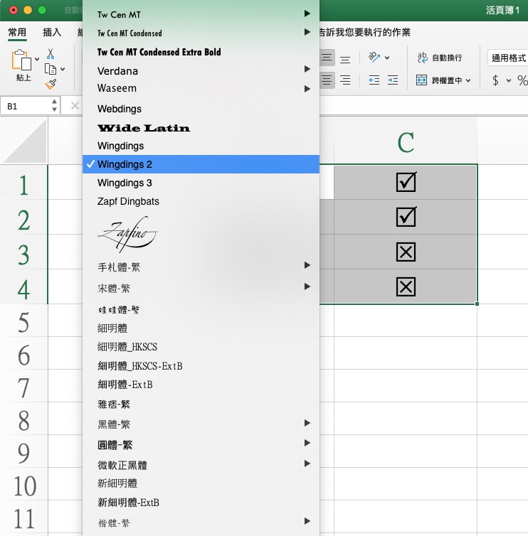 首先你將要置入打勾跟打叉的區域選擇起來後,選擇字型為「Windings 2」,一般來說,不論是在 MAC 或 Windows 裡,預設都會有這個字型。
