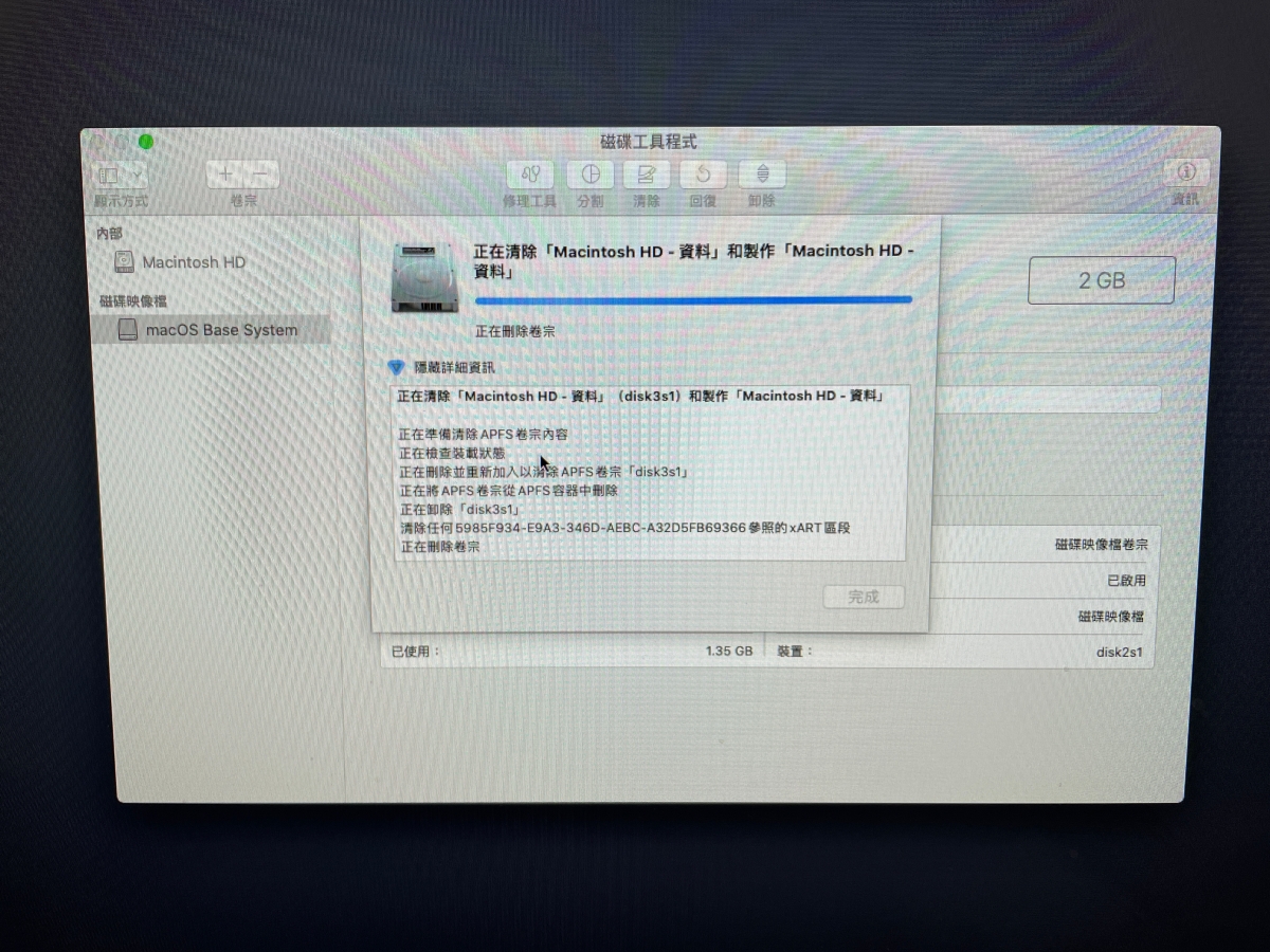 選擇你的資料碟後,再選擇清除,就會將資料都清掉,這邊你也會注意到有一個 macOS Base System,這也就是我們現在正在使用的 macOS 工具程式。