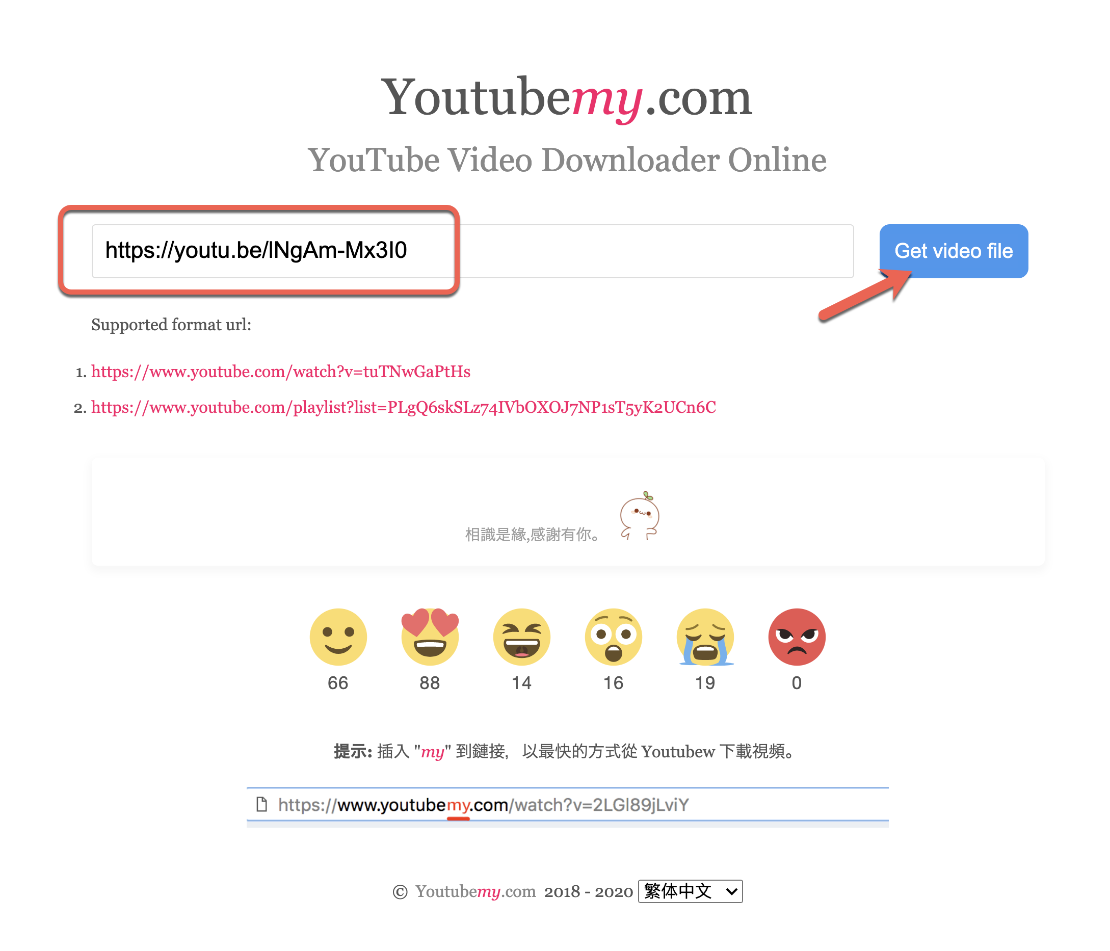 網站:https://www.youtubemy.com/首先,你如果要下載的話,可以到他的網站,貼上網址後按下 Get video file。