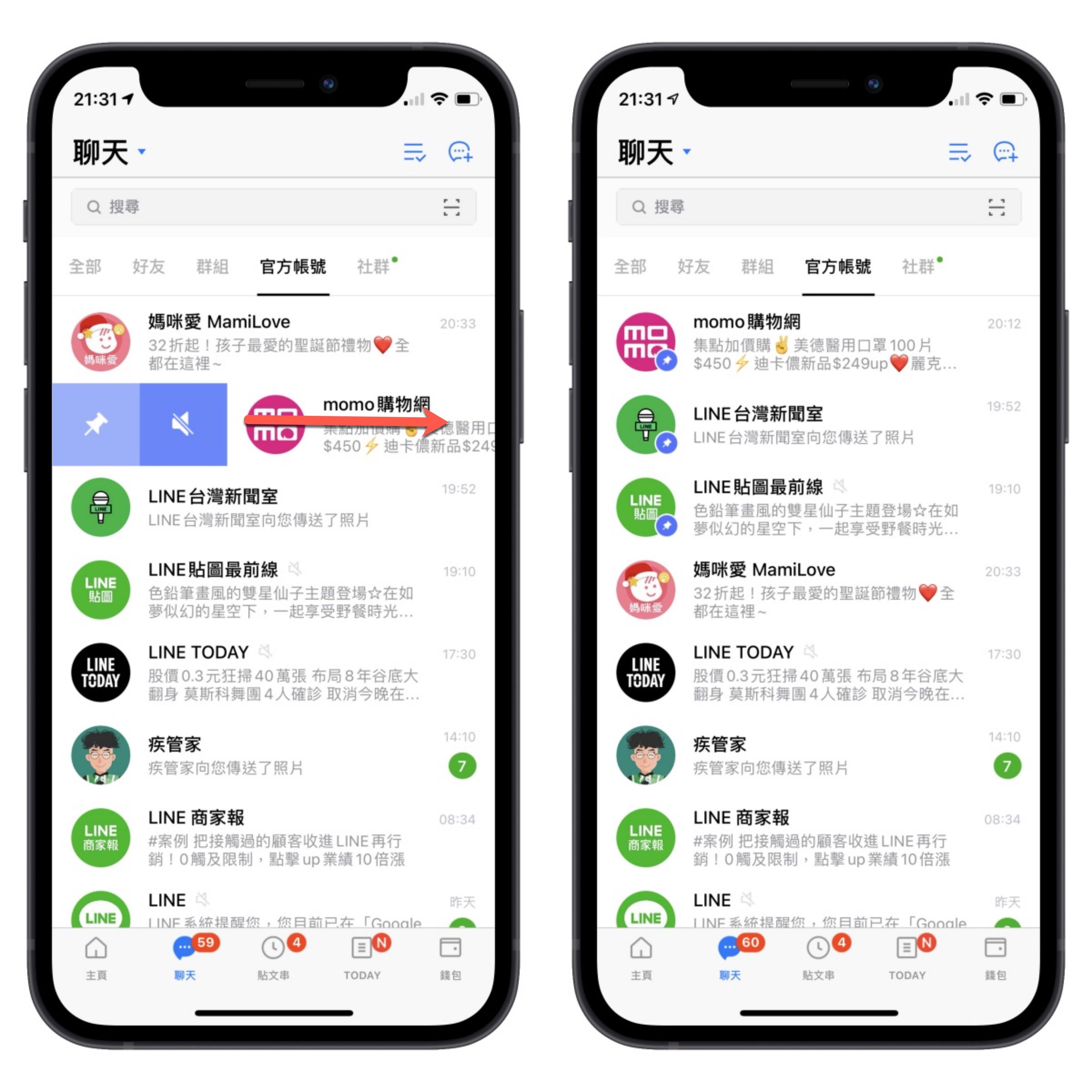 首先,我們可以先把想要加到捷徑的聯絡人往右拉之後,然後點擊圖釘圖示後就可以把聯絡人釘選在上方。
