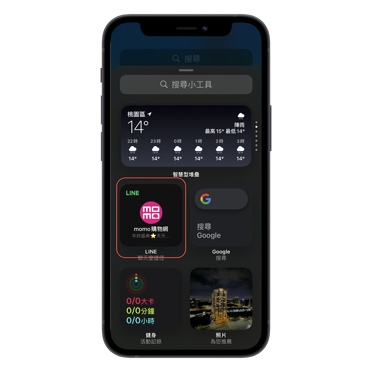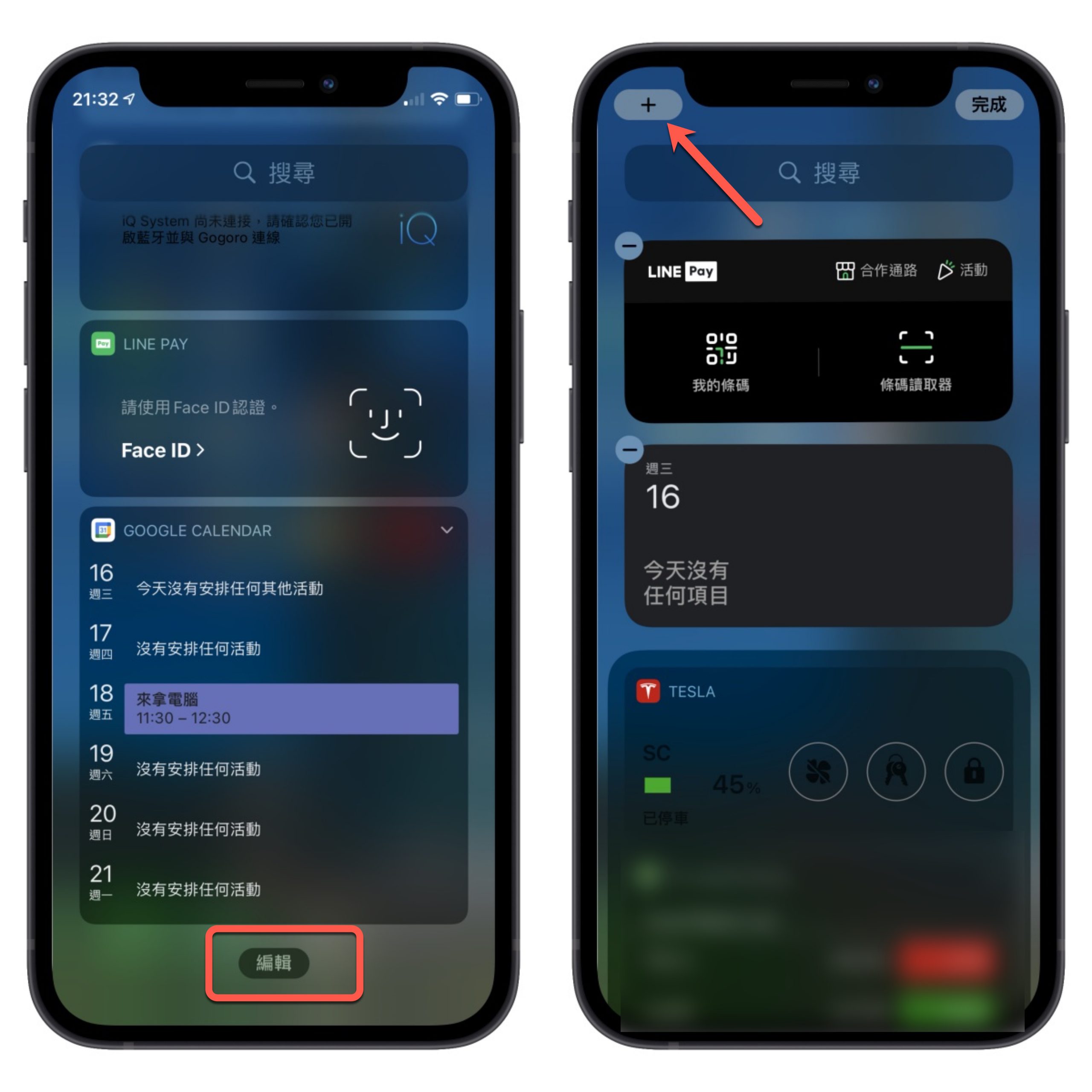 然後到你 iPhone 的主畫面後,往左滑到底進入小工具區,往下回到底進入「編輯模式」,然後點擊左上角的「+」。