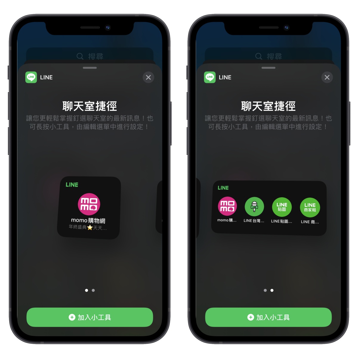 聊天室捷徑有二種,分別佔用 2x2 的大小以及 4x2 的大小,這二種也有點不太一樣的呈現往下來看。