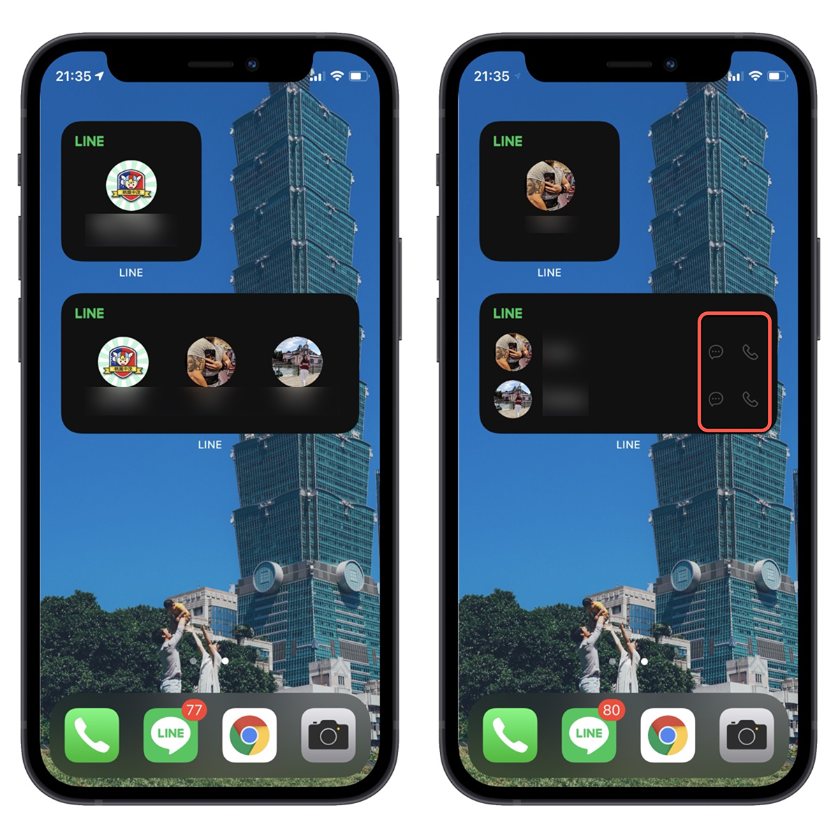 2x2 大小的主要顯示一個聯絡人,而 4x2 就有點不同了,一次最多顯示四個常用的聯絡人捷徑,但如果超過 2 個以上的話,就是會以圖示顯示,但如果只有二個或以下,會看到排列成上下,後方還會有訊息跟通話的圖示,所以最實用就是設定二個人以下,給大家參考一下。
