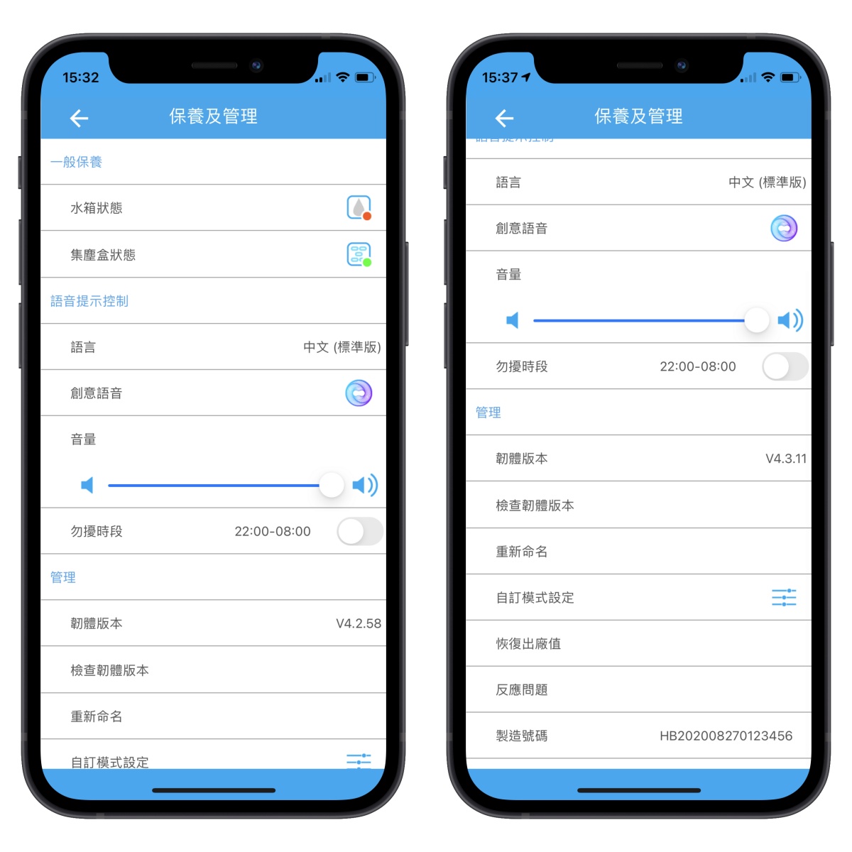 在保養及管理裡也可以看到目前水箱及集塵盒的狀態,其實每次啟動清掃時也都會顯示在介面上,這樣就知道要不要先去清空集塵盒,或是補水,其他像是前面提到的創意語音、系統音量調整等。