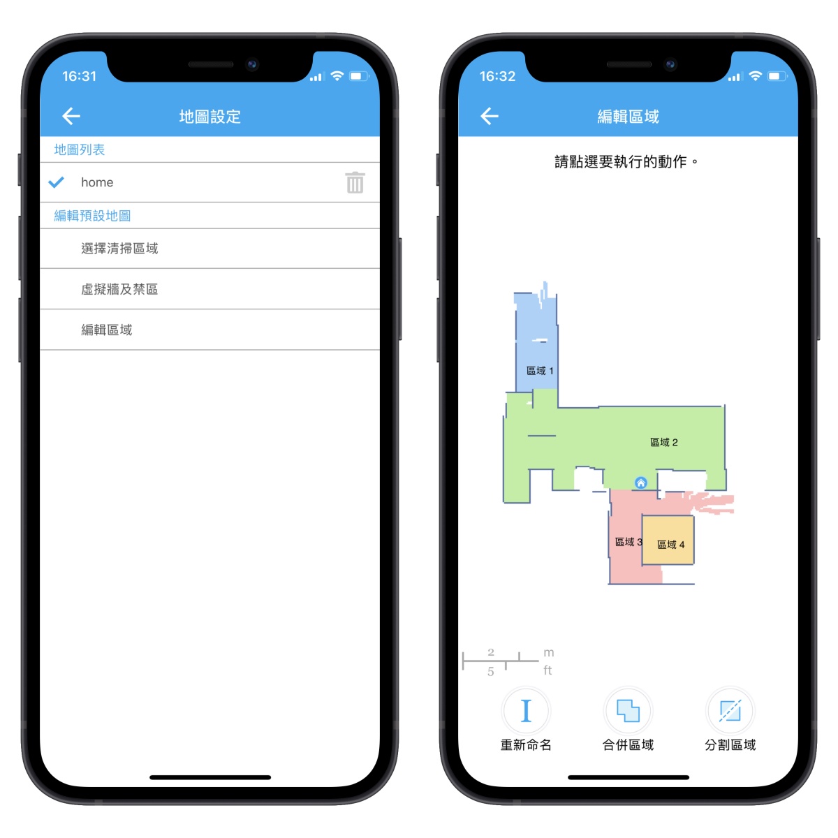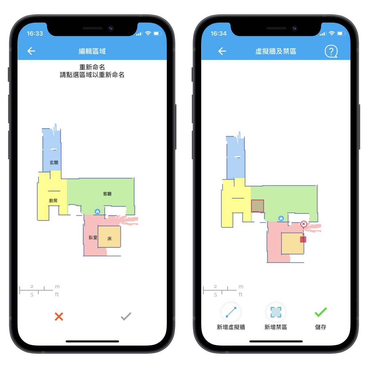 也可以為每個區域做命名以及設定虛擬牆及禁區,很多人到現在還是沒搞到虛擬牆跟禁區的作用差異,虛擬牆是設定一條線,也就是一道擋住的牆不過去,而禁區主要是一個框,一個範圍,比如像客廳放置拖鞋的門口,那就可以畫一個禁區,避免清掃時去打亂了擺放的拖鞋。