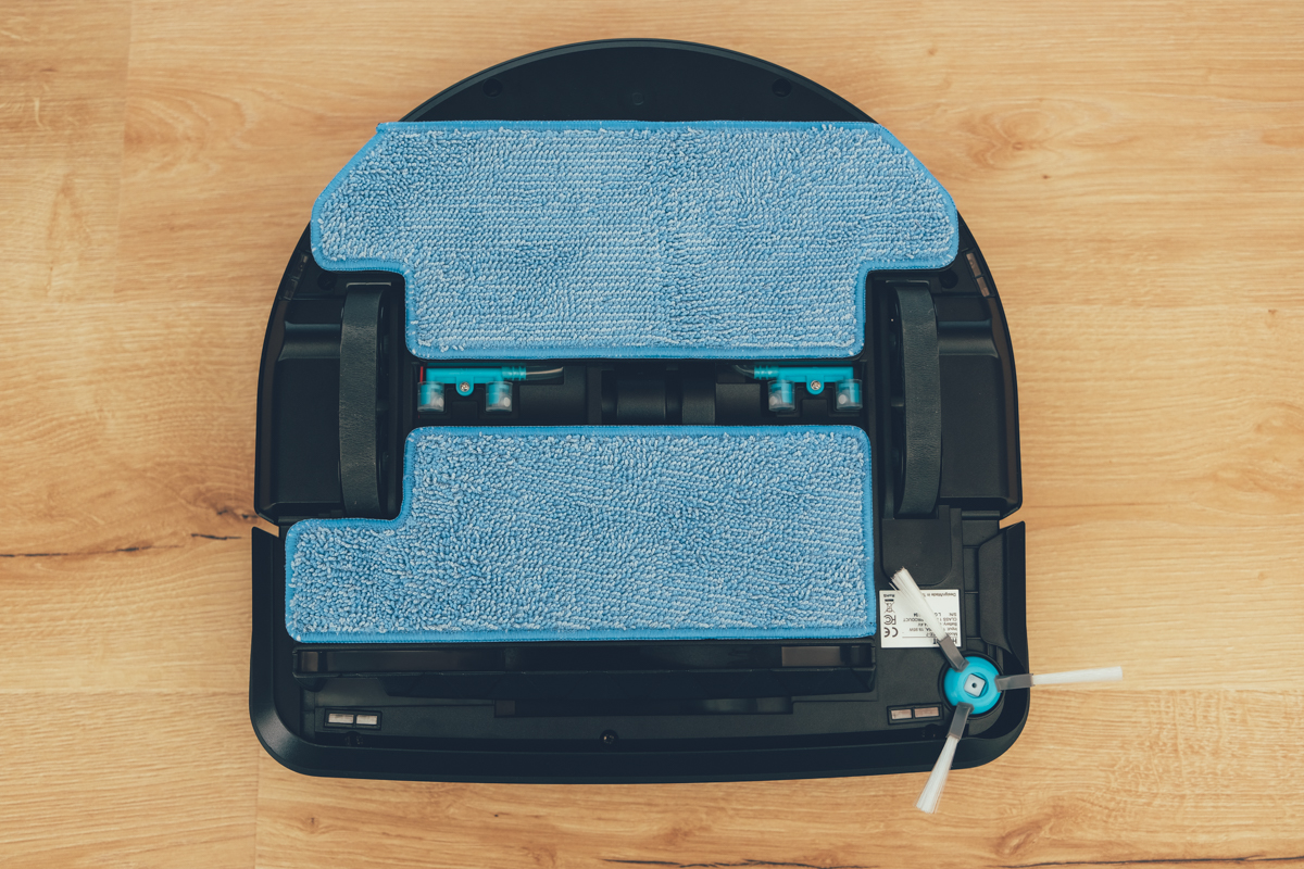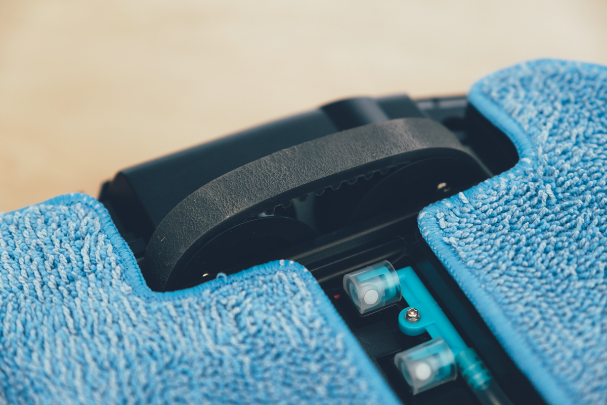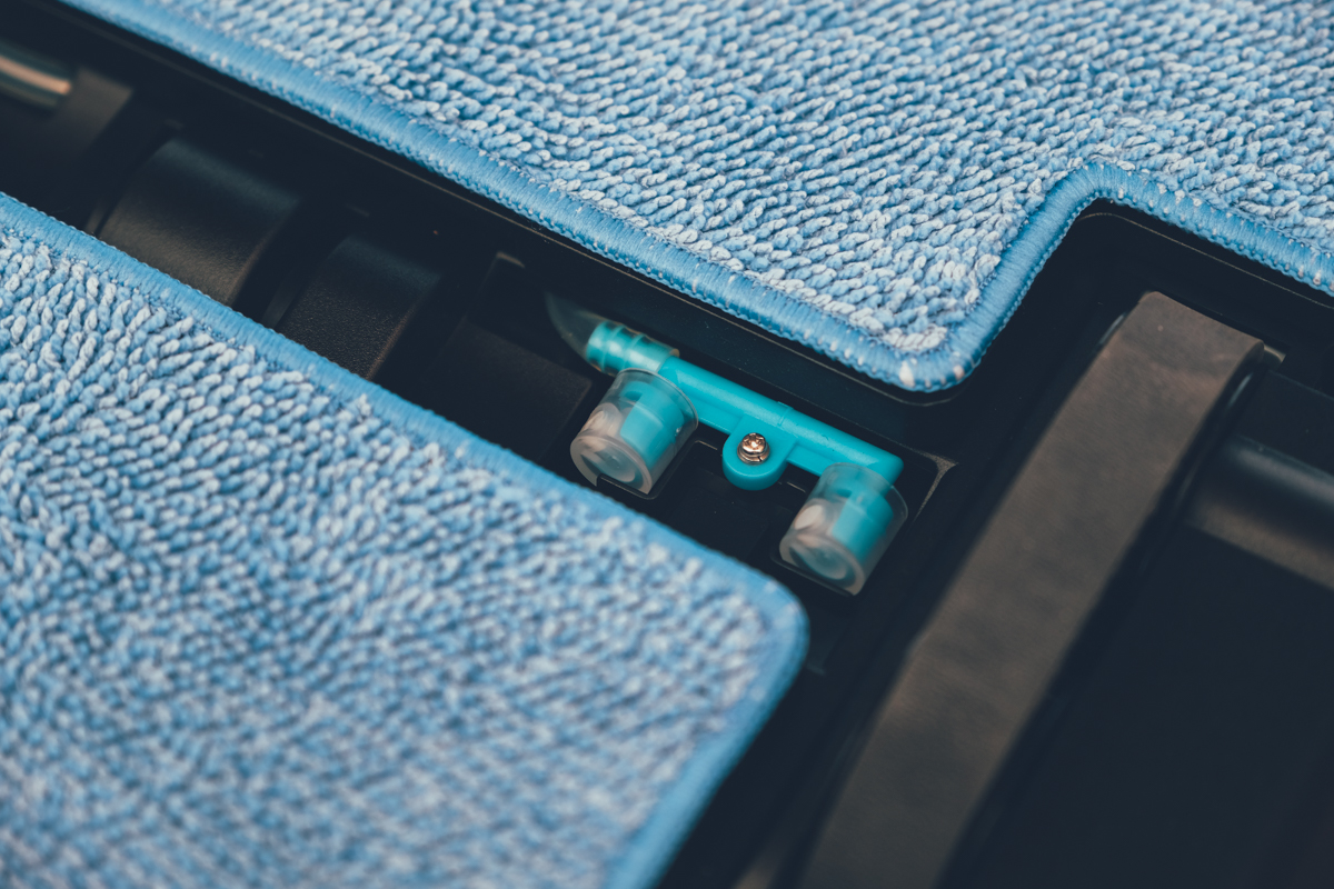 在四個角落共配置了四顆防墜感應器,上方為濕擦抹布,下方為乾擦抹布,所以拖完地沒有水痕千萬別誤以為根本沒拖到,透過智能感溫噴水,和拖地分開進行且均勻的噴灑水量,再加上履帶輪的設計,才會讓機過水無痕啊(而且清潔布真的很厚實,吸水一流)。