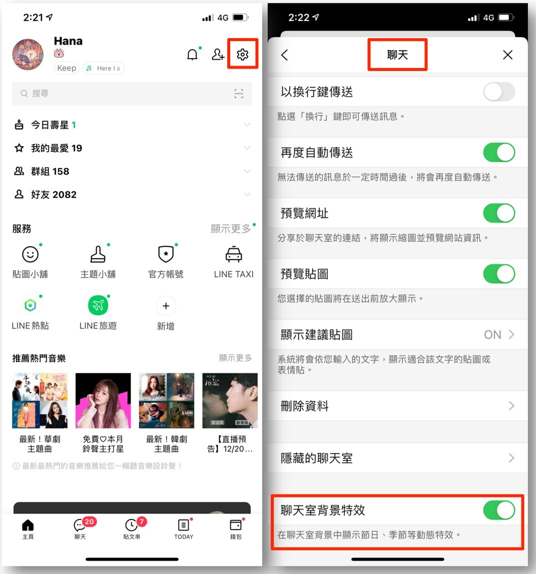 LINE 主頁「設定」(右上角齒輪圖示) > 聊天 > 聊天室背景特效,就能手動將背景特效功能關閉唷!
