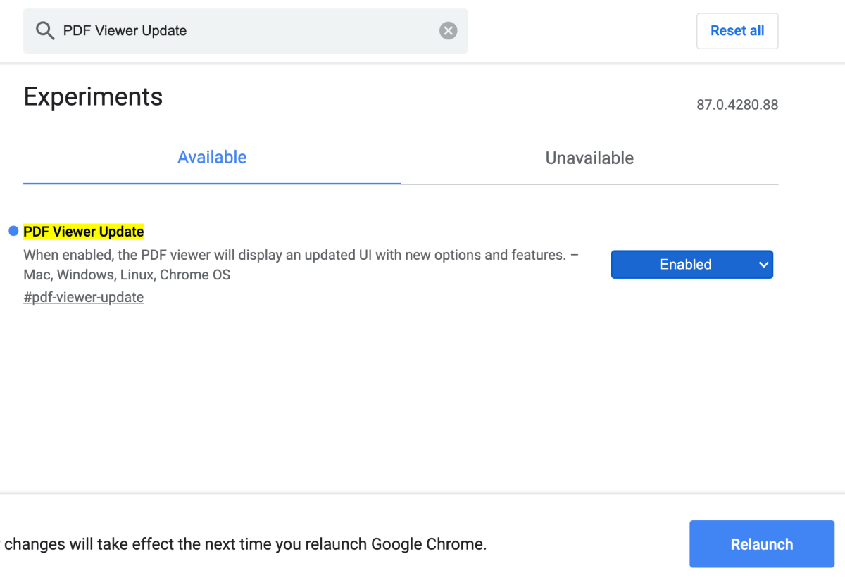 再來教大家啟用,在網址列先輸入「chrome://flags/」進入實驗功能的畫面,然後在最上方搜尋「PDF Viewer Update」,後方選擇為 Enabled 然後再按下右下角的 Relaunch 重新啟動瀏覽器就可以了。