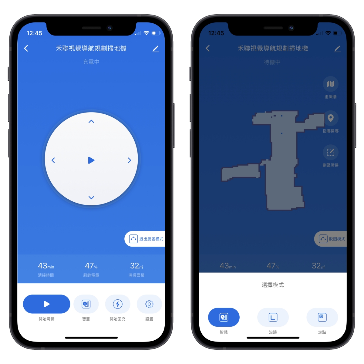 脫困模式則是切換為可手動操控的模式,透過自行控制方式來讓掃地機脫離困境,平常清掃的模式主要有三種,分別是智慧(沿邊加 Z 字)、沿邊、定點。