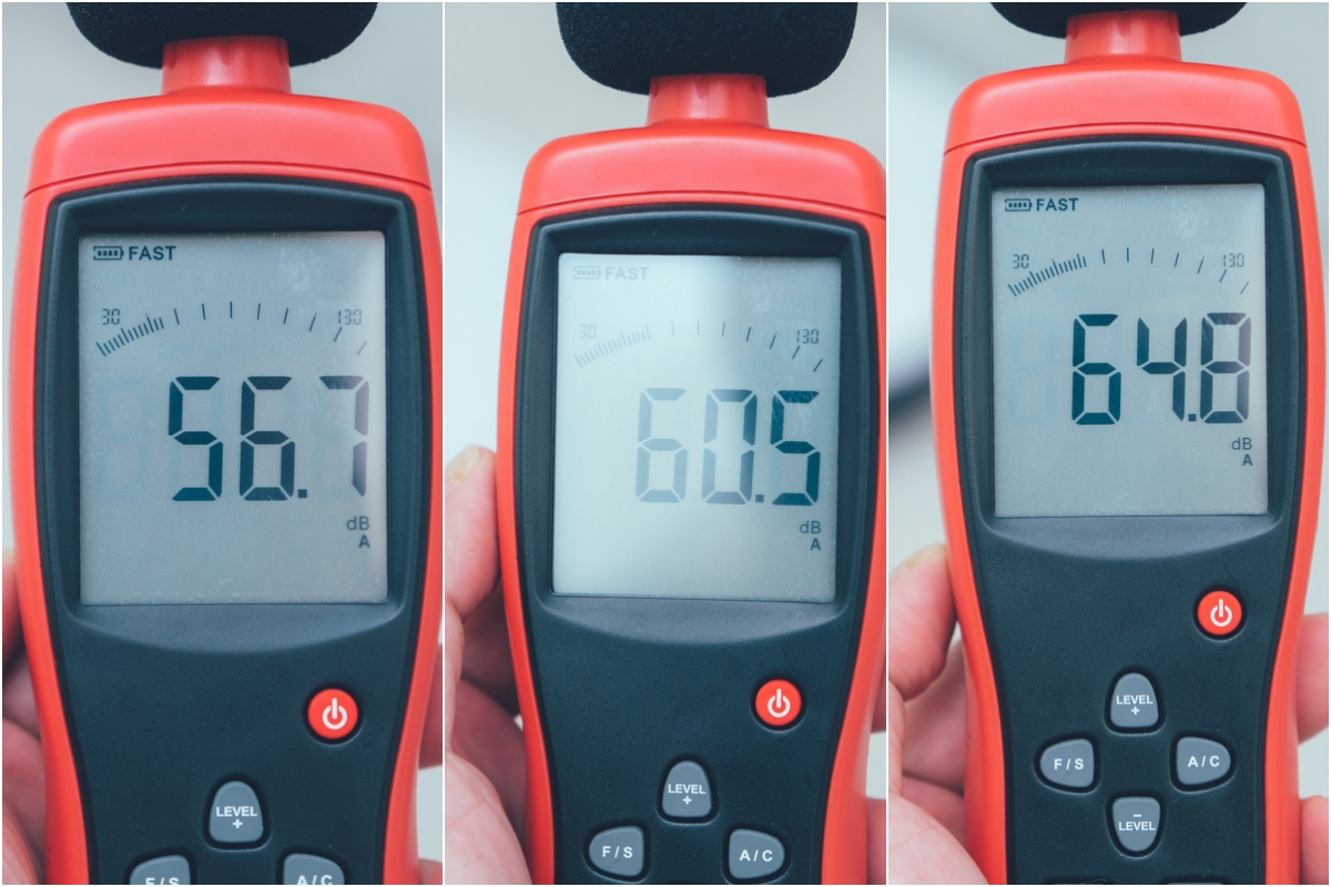清潔音量的部份,阿湯家裡在不開啟掃地機的情況下,分貝數大約會在 40 左右,,而以下的數據由左至右分別是靜音模式(-56.7dB)、標準模式(-60.5dB)以及強力模式(-64.8dB),以掃地機來說,這音量算是相當的小,而且實際現場聽的聲音其實會比這數據更低一些的感覺(同樣二台 -60dB 的掃地機,你會覺得禾聯的小聲一點)。