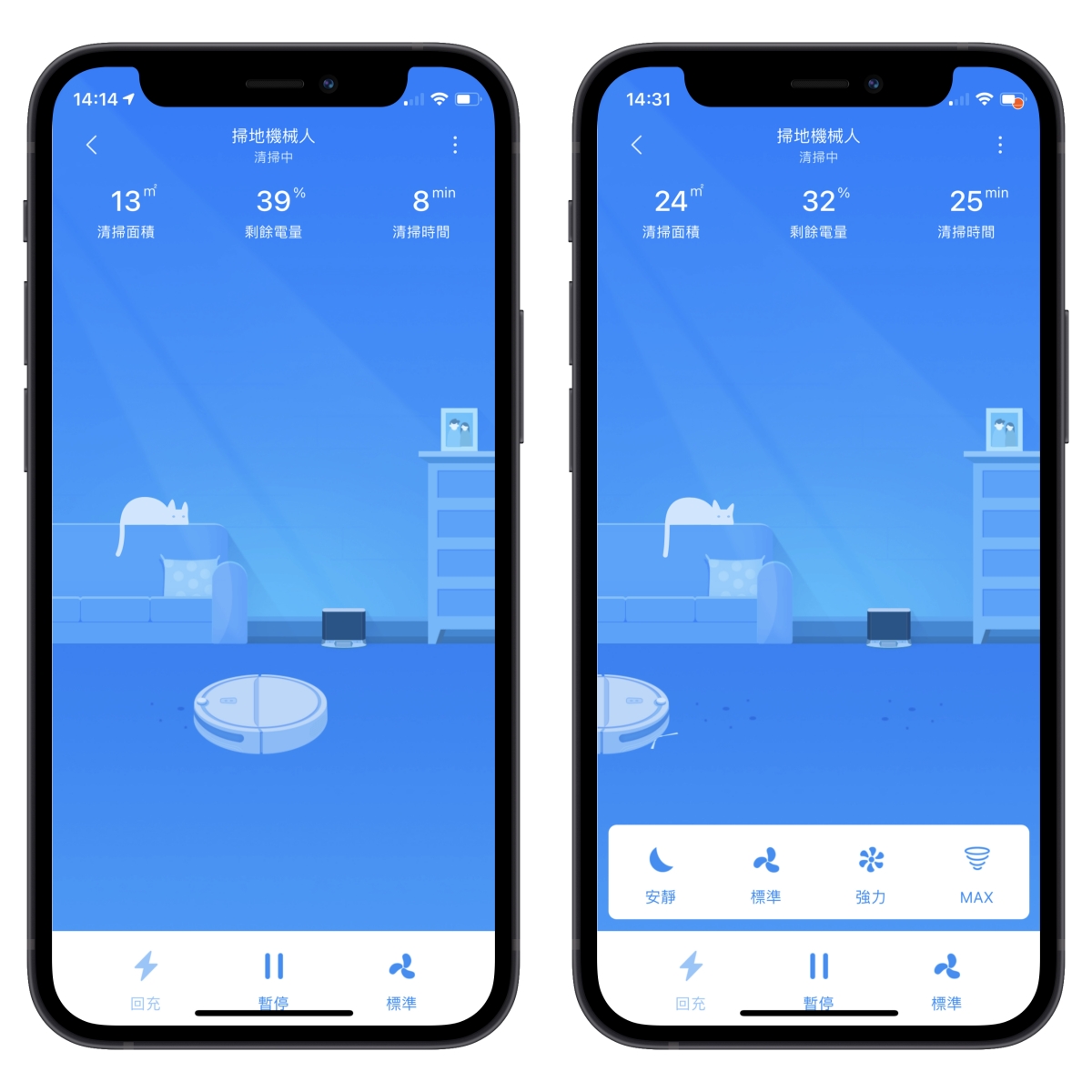 平常我家的喵星人聽到掃地機啟用都會光速跑走,躲到不見貓影,所以我這次特別用了輕柔模式來試看看,可以看到我家的大大一點都不在意的繼續清理他的毛,應該就知道差異了吧。
