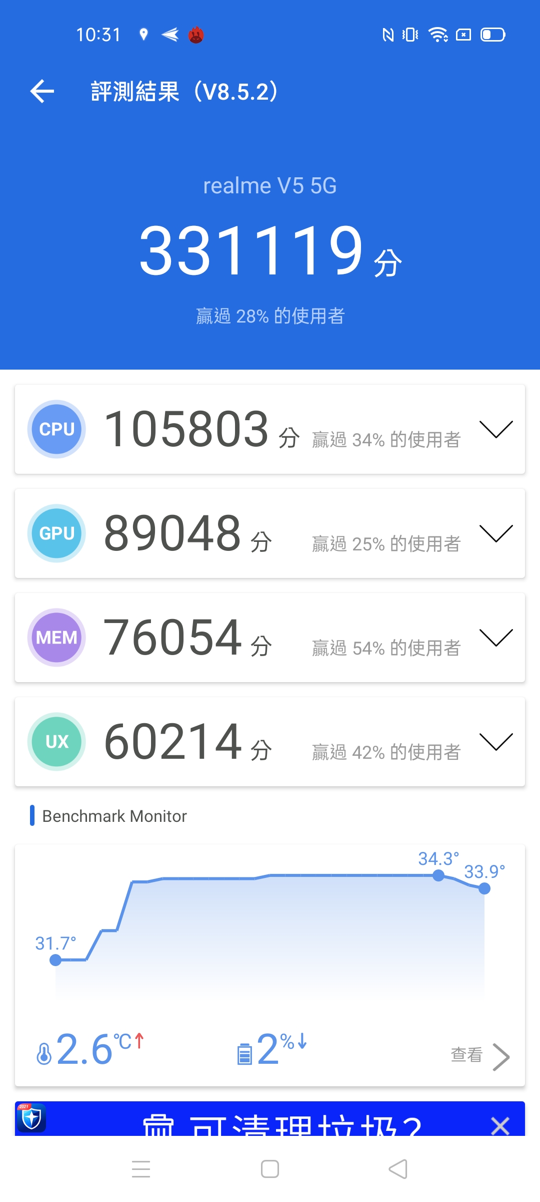 透過安兔兔測試分數為:331119,是的,現在連平價手機跑安兔兔都超過 30 萬了,真的相當的驚人。