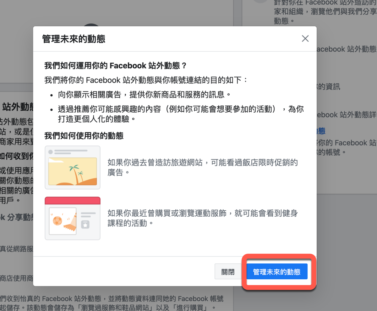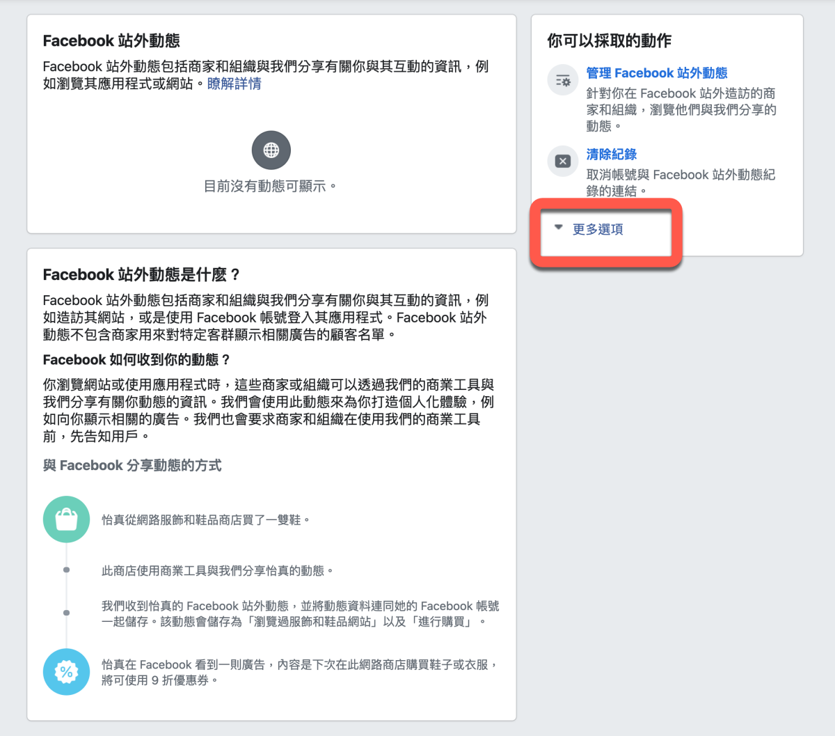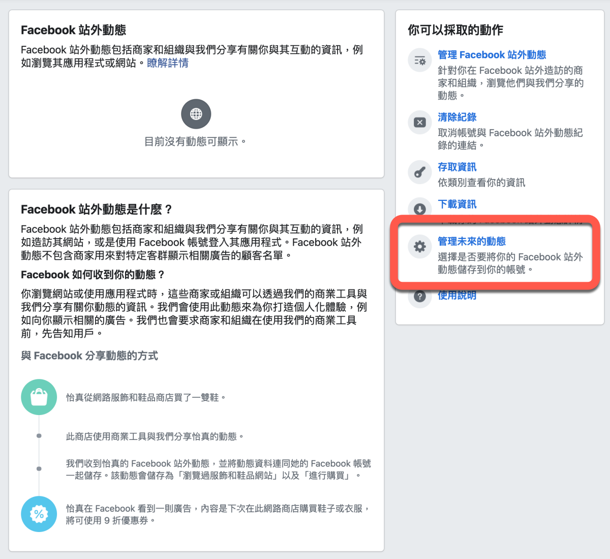 進入 Facebook 站外動態設定頁面,直接點擊右上角的「管理 Facebook 站外動態」。