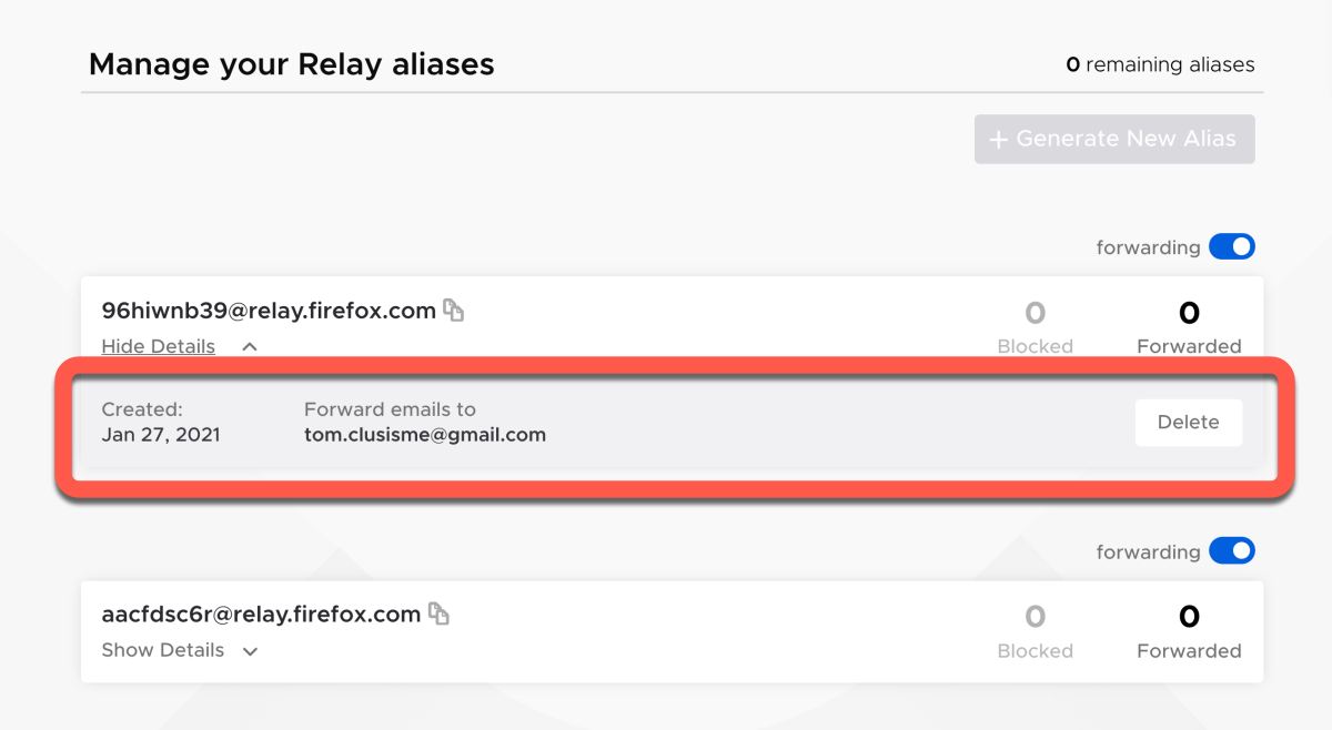 而不使用的就可以按下 Delete 刪除,其中你也可以注意一下 Forward emails to,會是你註冊 Firefox 的帳號,這是無法各別更改的,註冊用哪一個就只能轉發去該 Email。