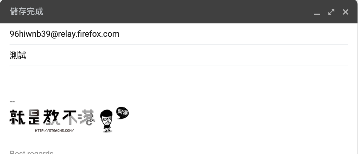就像這樣,當別人要寄信給你時,給他這臨時的 Email 就可以了,會自動幫你轉發到你的信箱,但要注意的是,附件不能超過 150KB,如果有要帶附件的話,建議還是給自己的 Email,另外還有個小缺點是容易進到垃圾信箱,自己再多注意。