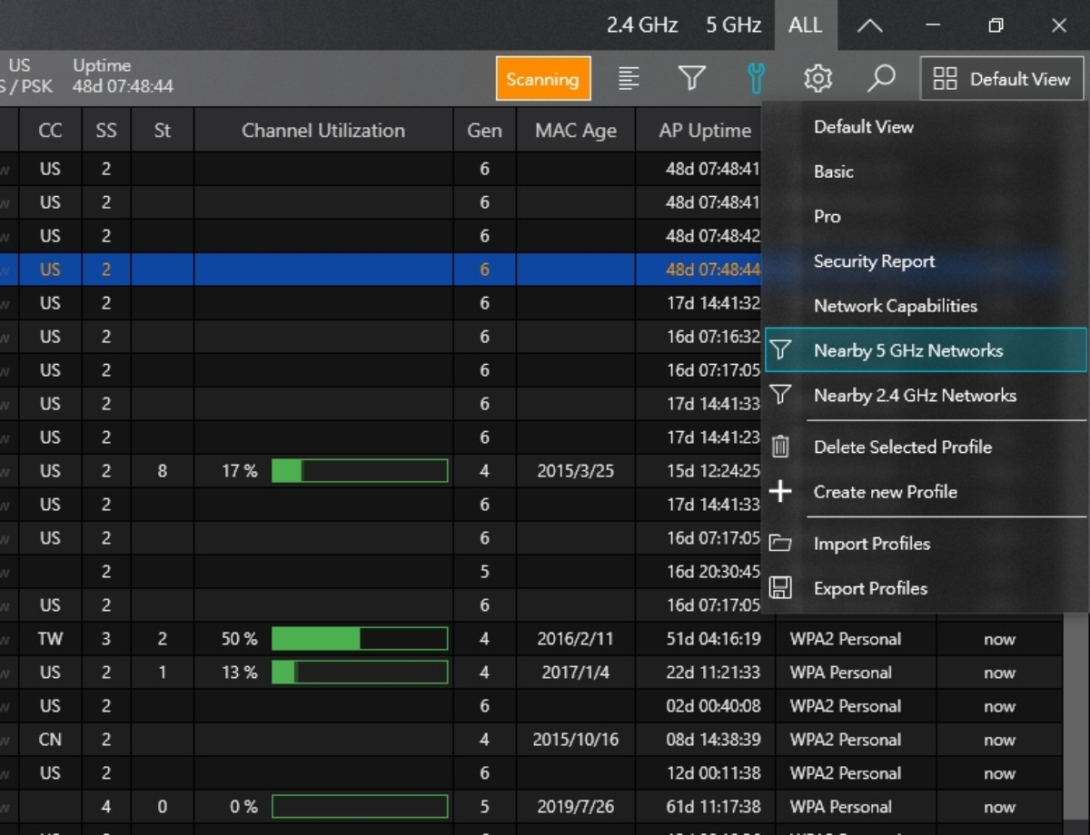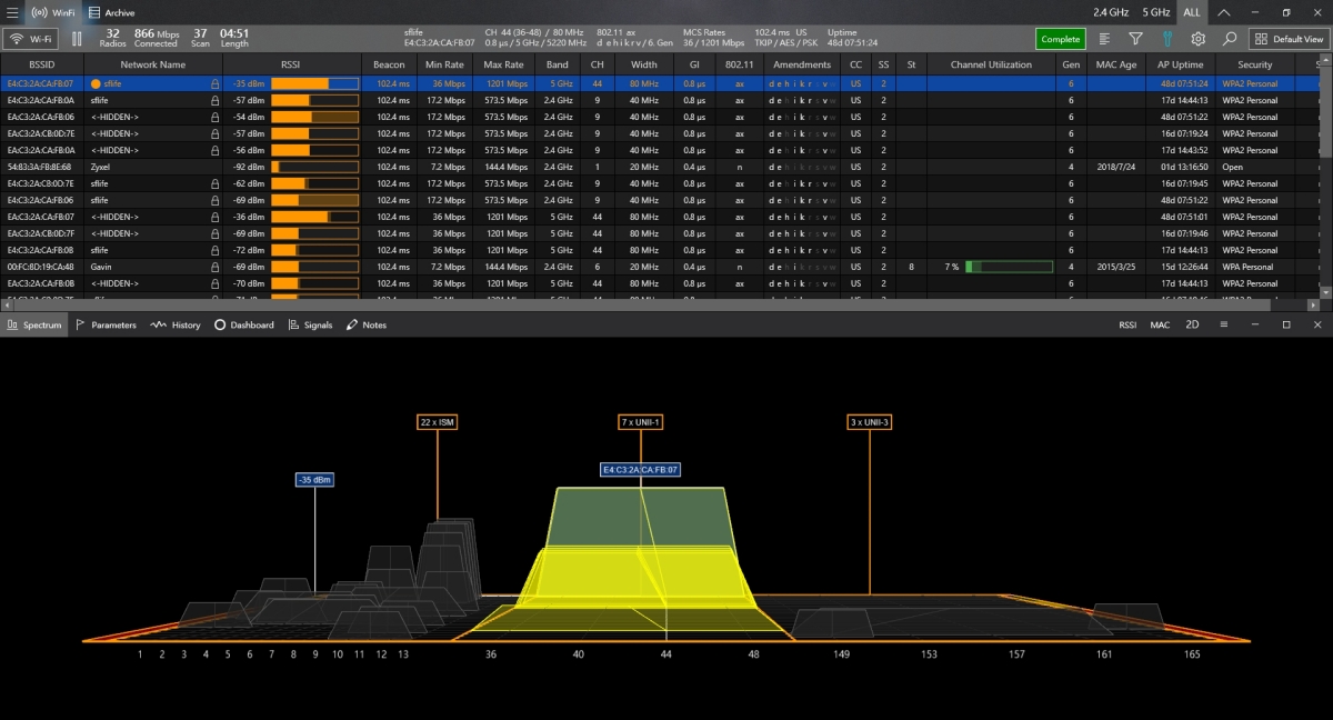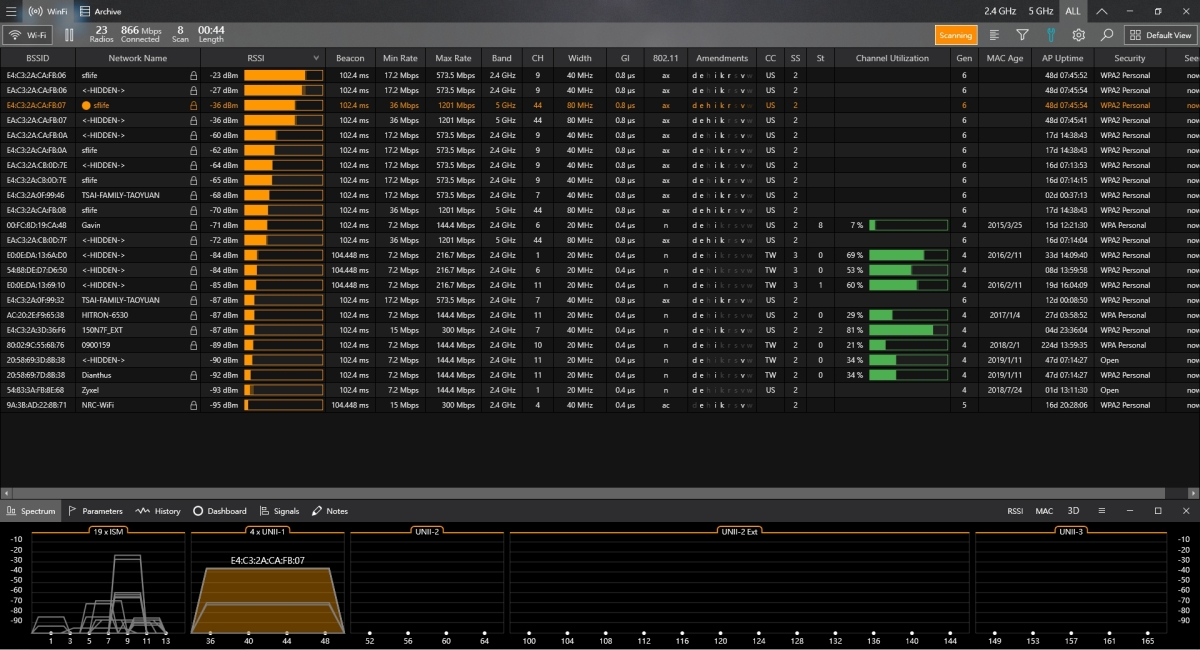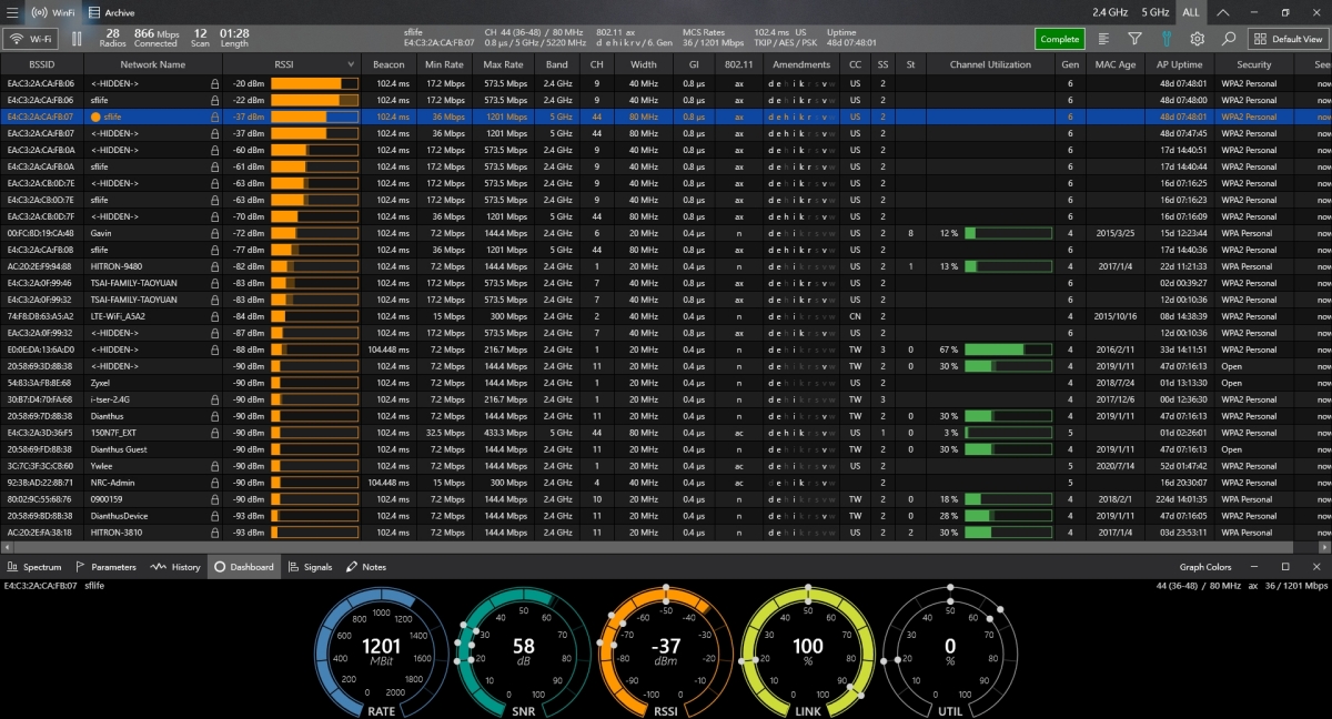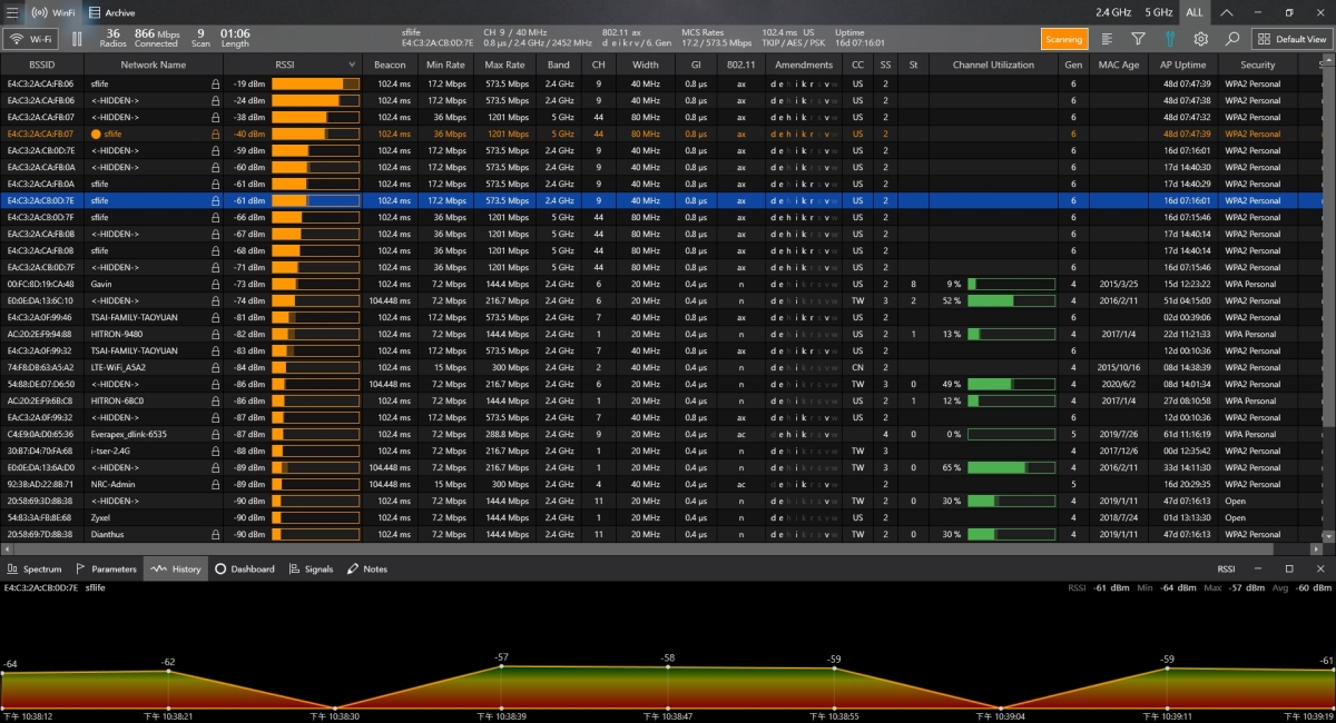 安裝我就不解說了,Windows 10 的話有可能會出現不安全警示,可以點擊其它資訊再繼續安裝就好了,第一次啟動會需要更新資訊,然後進入 Helge Keck 就會立刻看到所有你能抓到的 Wi-Fi 訊號資訊,像是 RSSI(訊號強度)、連接速度(Mini Rate 跟 Max Rate),還有 Band 頻道及 Width 頻寬等,最後面還有 Security 安全加密方式等,我這邊都還不錯,至少都有 WPA。
