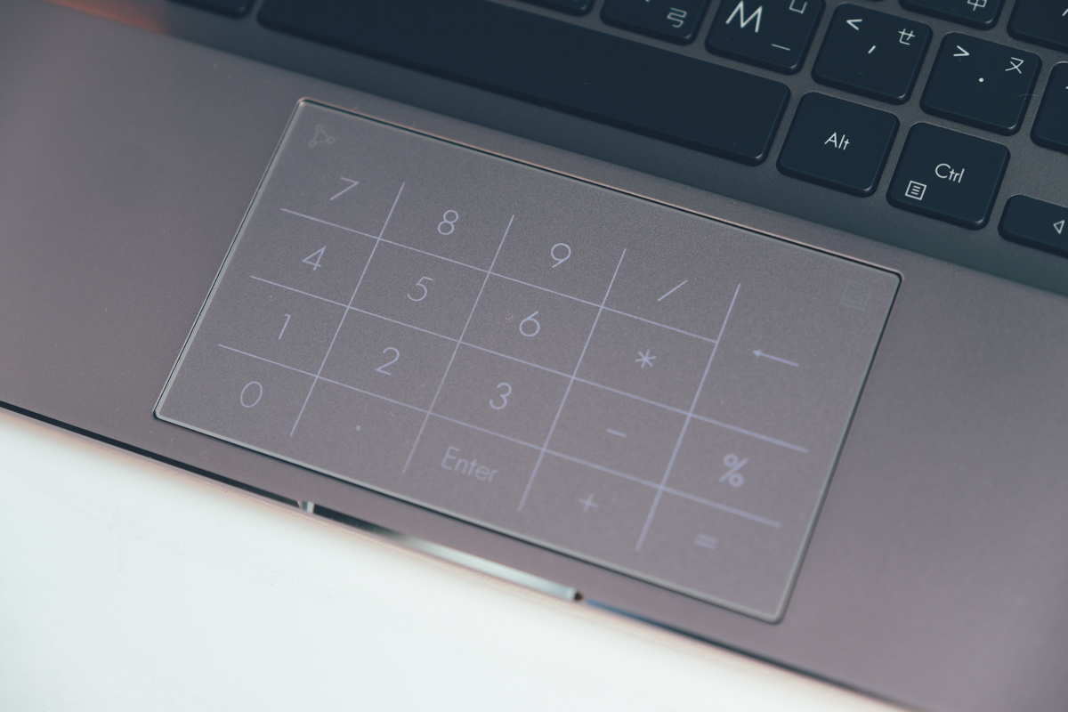 TouchPad 的部份,也搭載了虛擬數字觸控板(NumberPad 2.0),只要點擊觸控板右上角的小 icon 便可開啟,彌補了一般 14 吋以下筆電沒有完整數字鍵的部份,透過這 NumberPad 仍然能讓我們快速的輸入數字及運算,也可以隨時再切換為觸控板功能,但即便在開啟虛擬數字鍵的情況下,觸控板仍可正常控制游標,這也是 ASUS 獨家才有的功能。