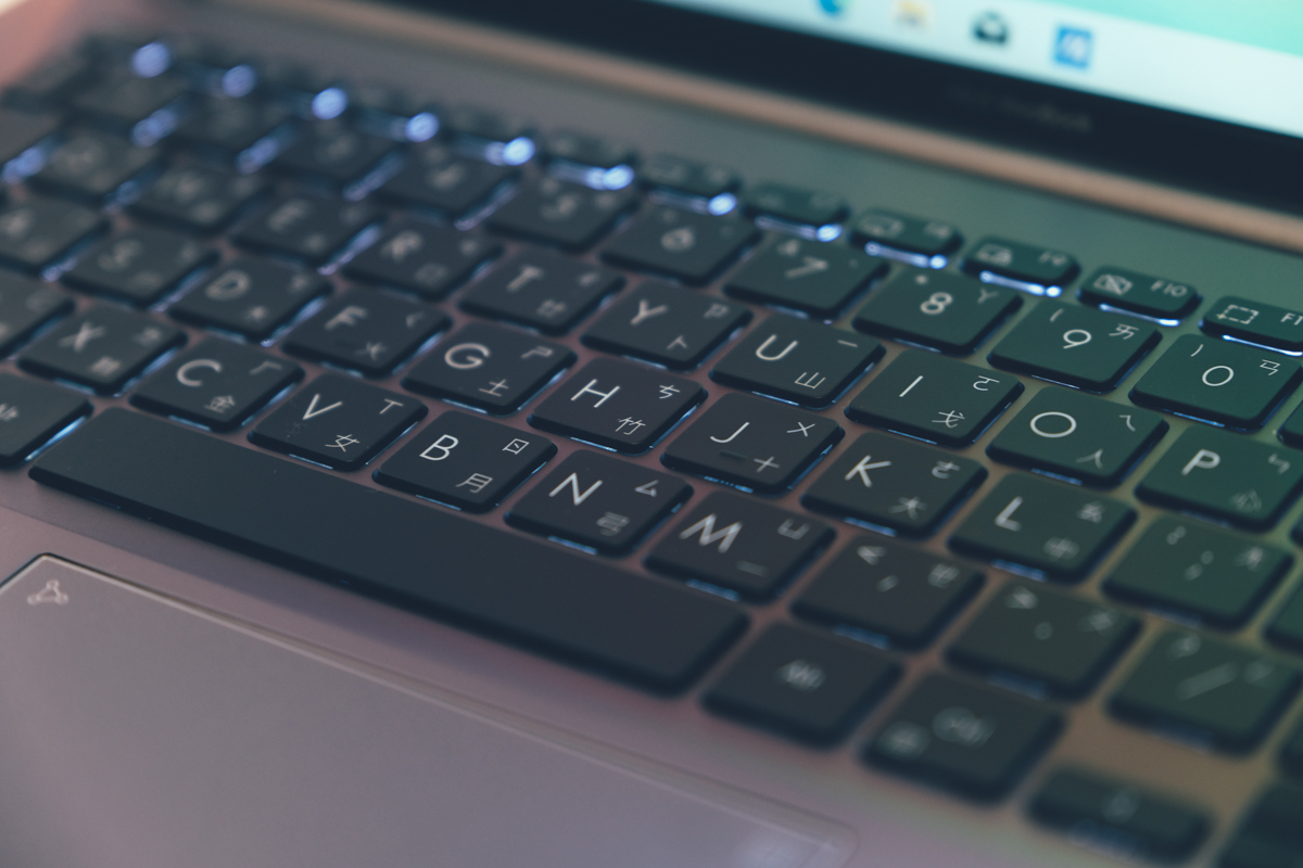 採用全尺寸背光鍵盤,鍵程為 1.4mm,是 14 吋筆電最常見的鍵程距離,而在 ASUS 的按鍵設計上,現在也多了可以自由切換 Fn 按鍵的使用,該我們在使用快速鍵時更加方便(就是可以選擇要不要按住 Fn 再去按 F 功能鍵)。