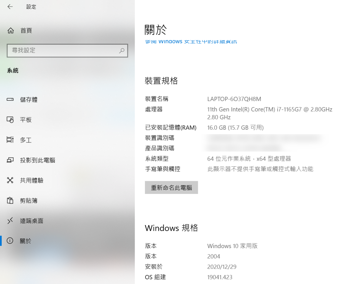 - 作業系統:Windows 10 Home