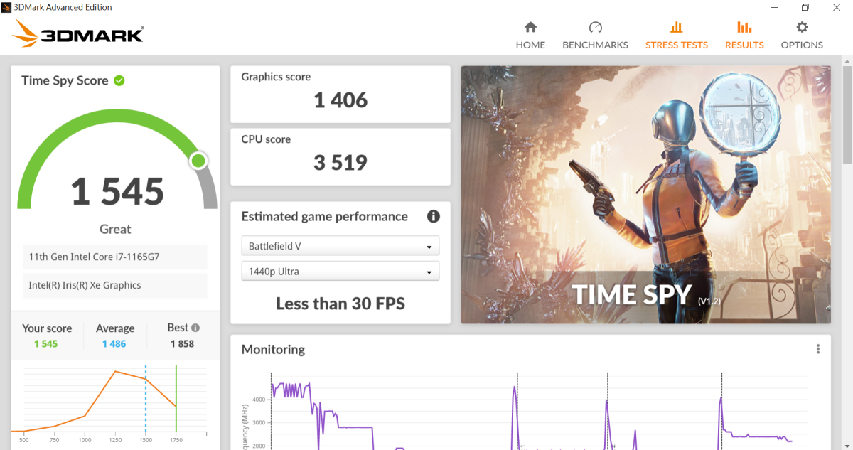 3DMark 透過 Time Spy 獲得 1545,而 CPU 的分數也高達有 3519,相當不錯的效能。