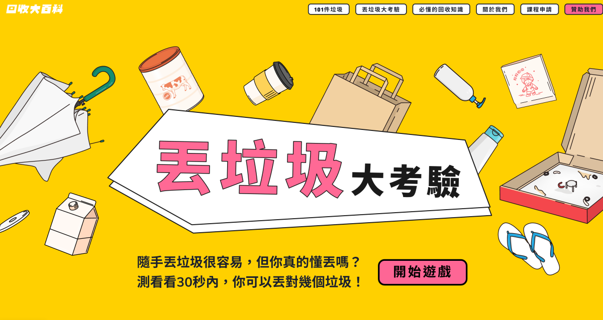 進入網站後,在右上角主要有三個選單,分別是查看 101 件垃圾的說明、分類遊戲以及回收知識。
