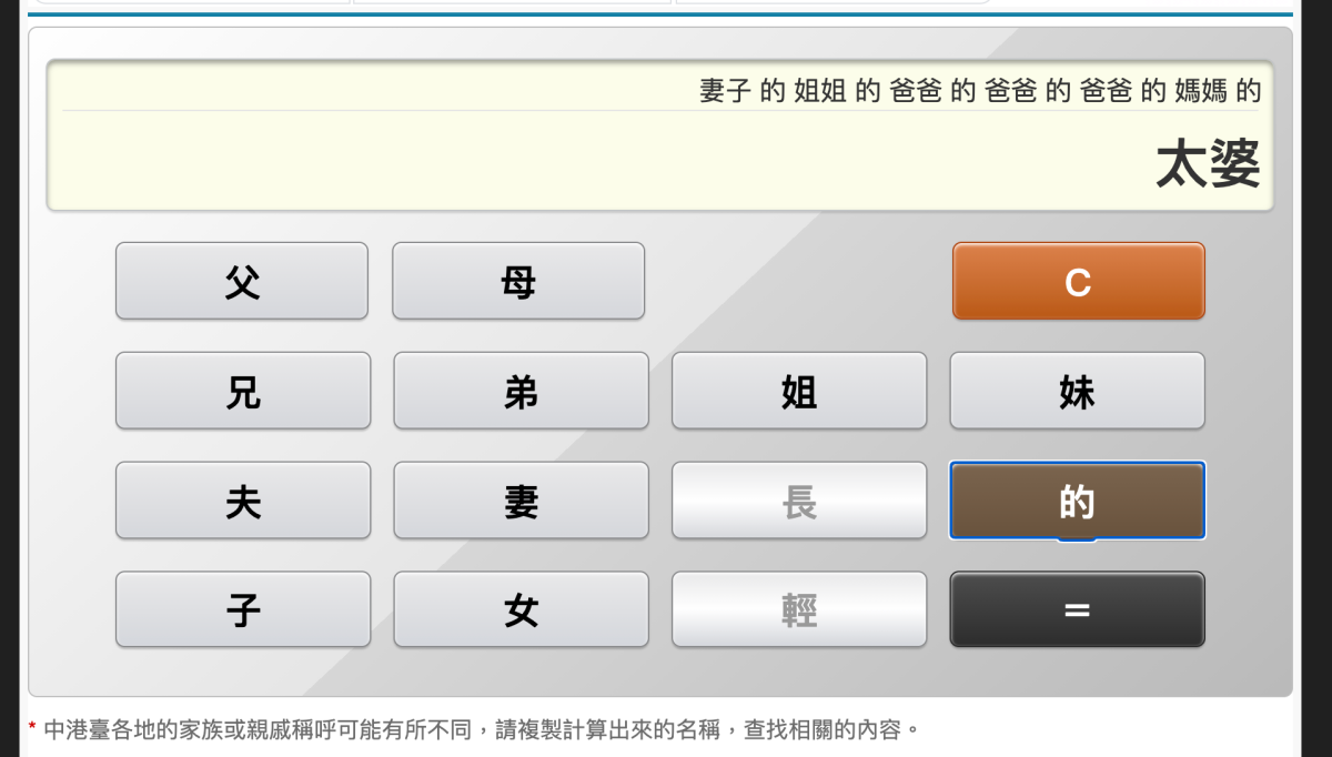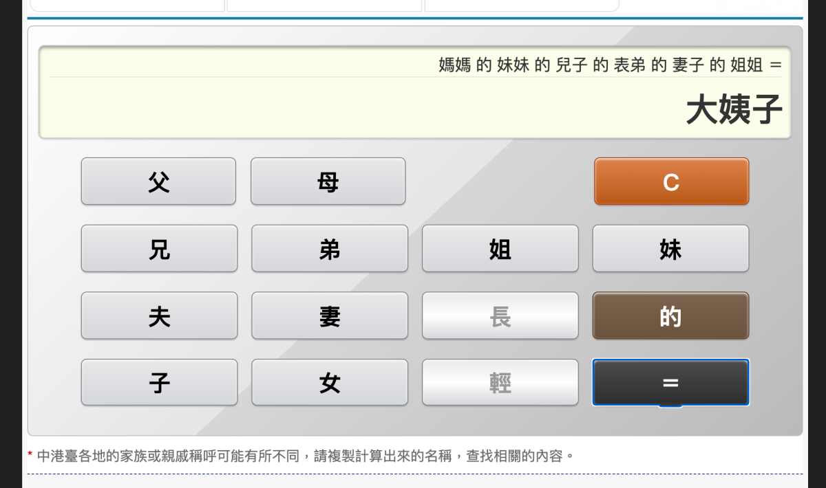 網站:https://www.ifreesite.com/kinship/進入網站後往下拉一點就會看到這個計算機了,基本上就是直接按關係開始按,比如老婆的姐姐的爸爸的爸爸的爸爸的媽媽,會是叫太婆(我也不確定是否正確)。