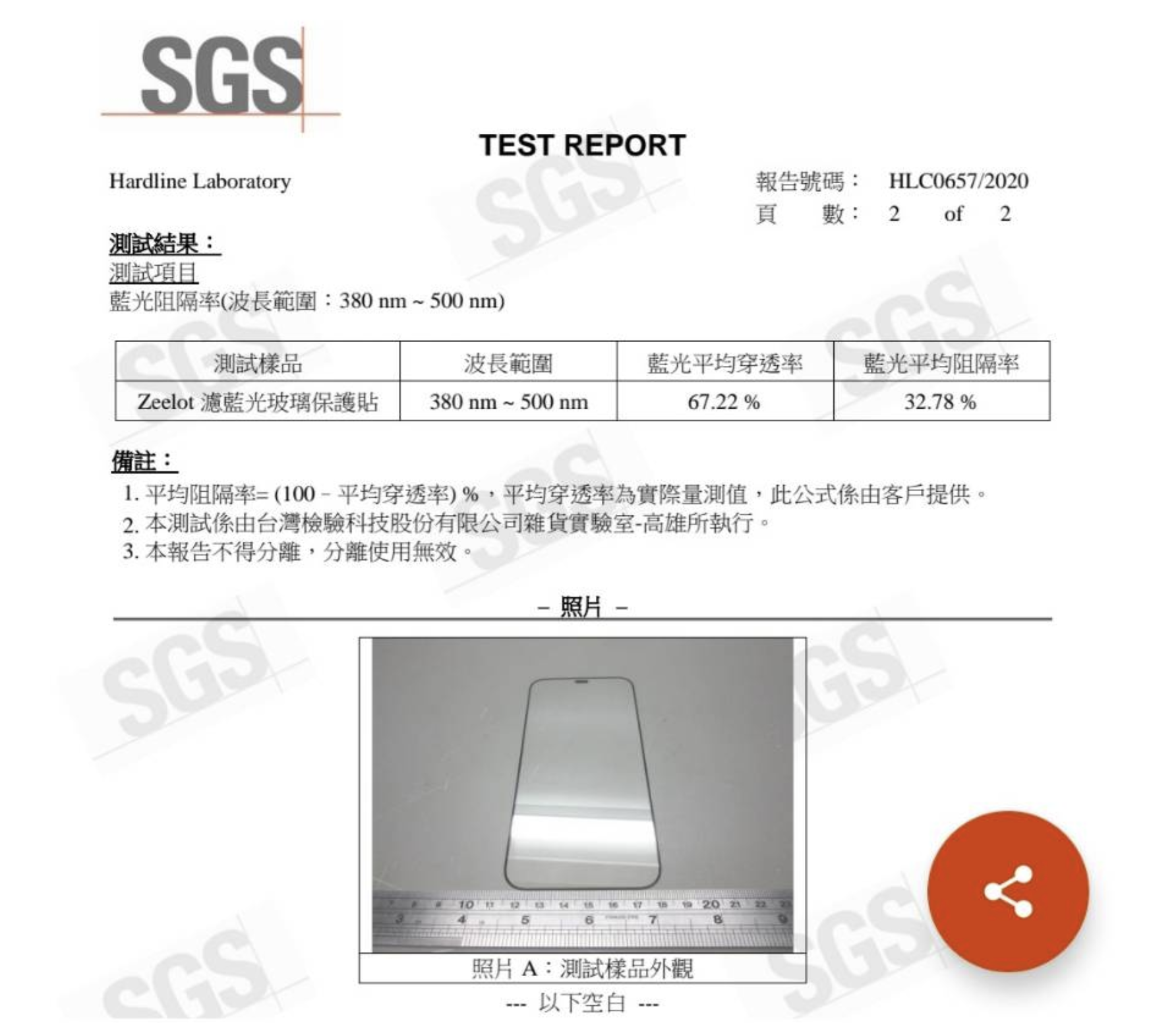 我會一直執意要等到 Zeelot 的抗藍光版本推出不是沒有原因的,因為市面上我真的不知道還有哪幾家有送 SGS 檢測藍光的阻隔率,只要你稍微的去 Google 一下會發現,市面上很多所謂的抗藍光保護貼,實際上檢測後發現阻隔率都在 20% 以下,甚至還有 10% 以下的,可以說是沒什麼效果,而 Zeelot 的抗藍光玻璃保護貼阻隔率可以達到近 33%,真的相當的高,而且是透過具有公信力的 SGS 來檢測,這樣才能用的安心,不然你抗藍光是要抗心酸的嗎?