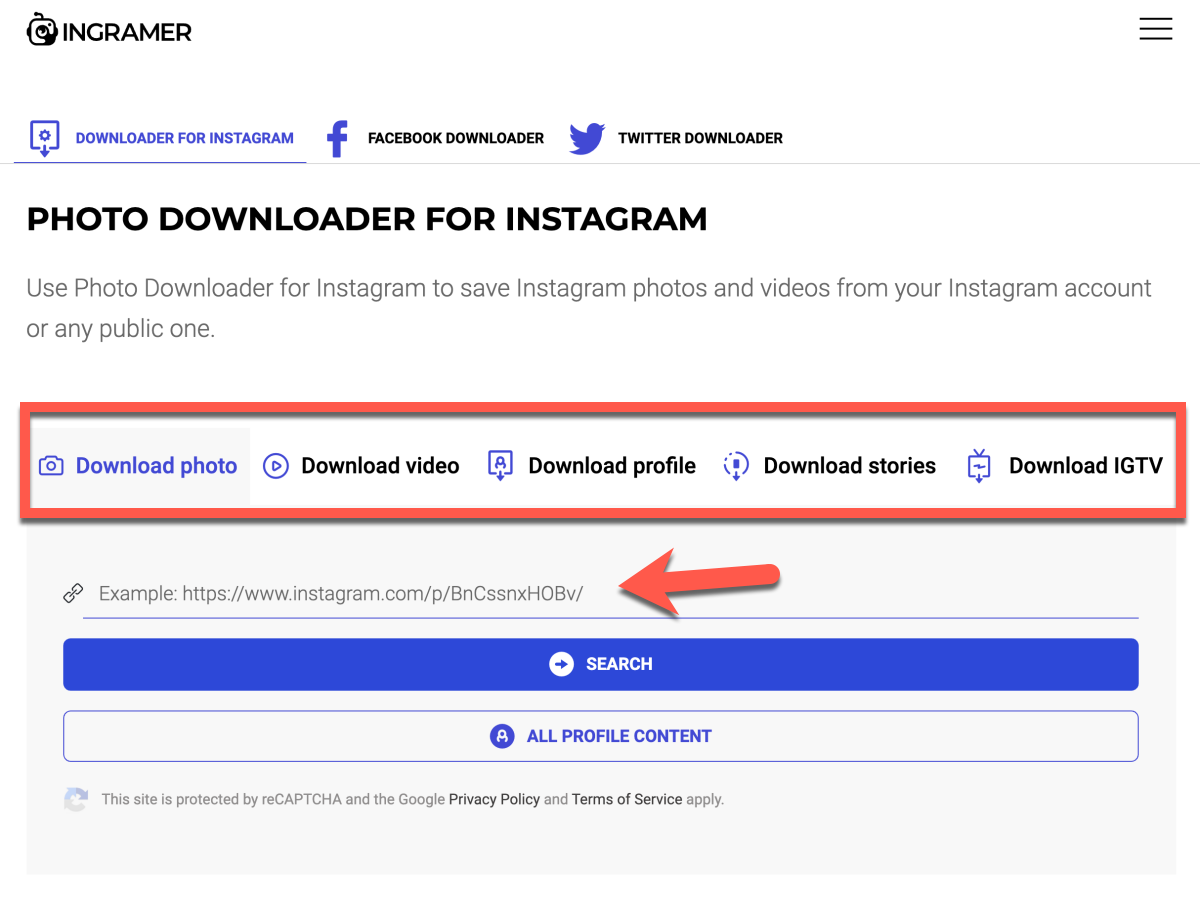 網站:https://ingramer.com/downloader/instagram/photo/進入網站後,一共有五種選擇,不過 Download profile 是要付費的,其它都可以直接選擇使用,將你要下載的 IG 網址貼上來就可以了。
