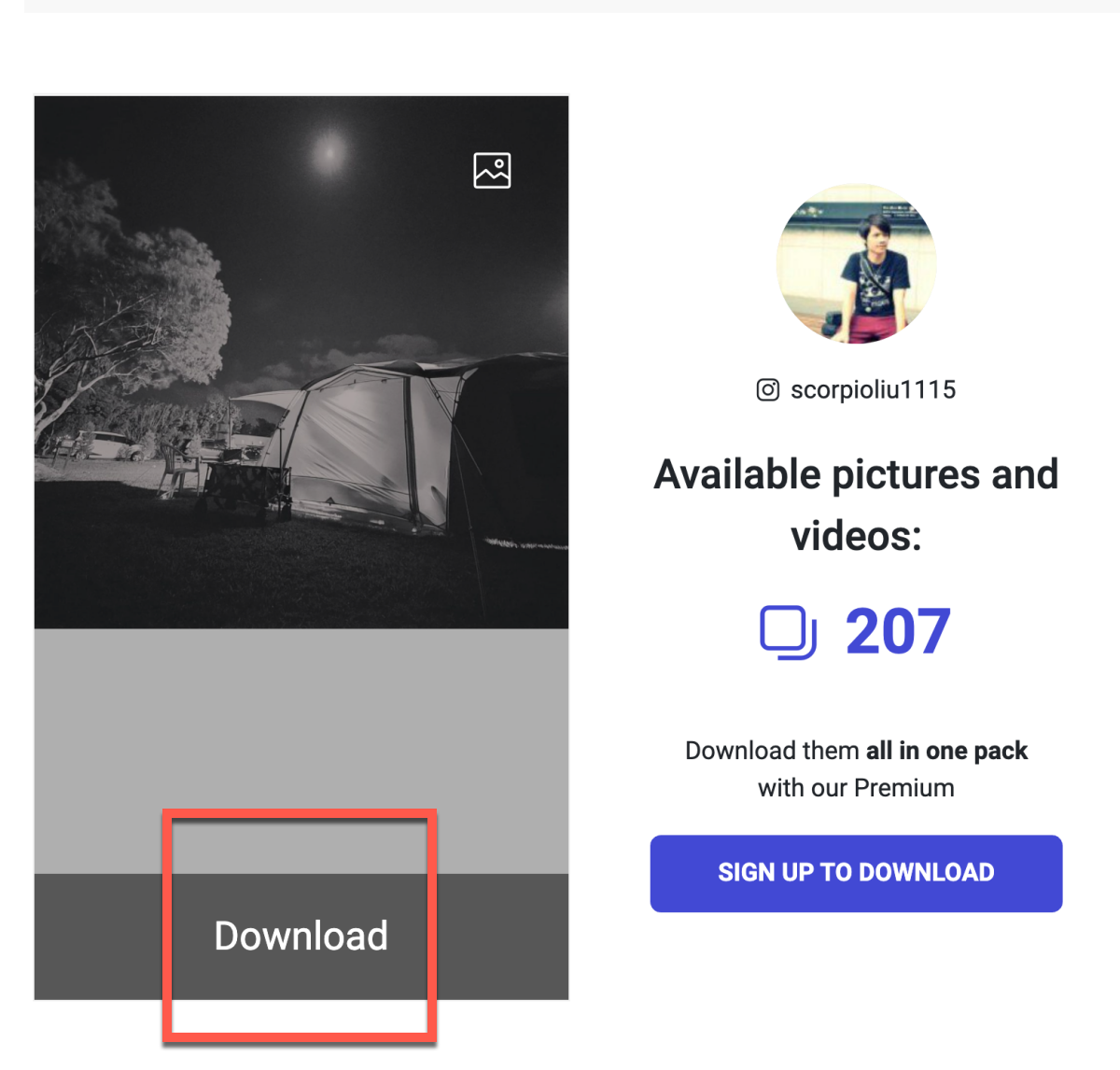然後就會在下方顯示你要下載的照片,按下 Download 就會開始進行下載,如果你想要將對方的 IG 全部打包,那麼也可以付費來搞定,比如一個月 3 美金可以下載 3 個人的個人檔案打包檔,如果真的有需要的話,這價格應該不算貴,相當值得一用。