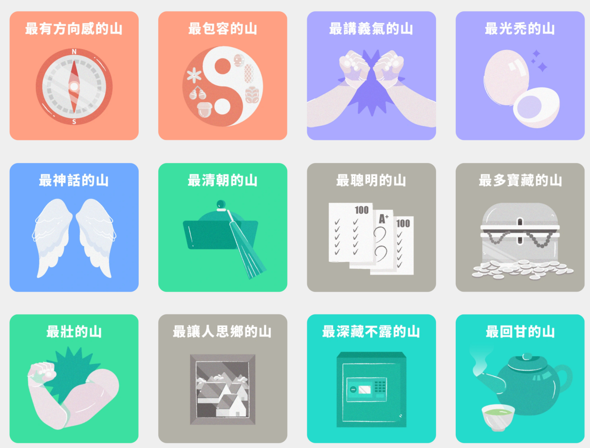 阿湯最喜歡的部份就是,每座山都有給他一個形容,而不是直接列出山的名稱,當你先看過形容後,猜一下再翻牌,我想會讓你會心一笑的。