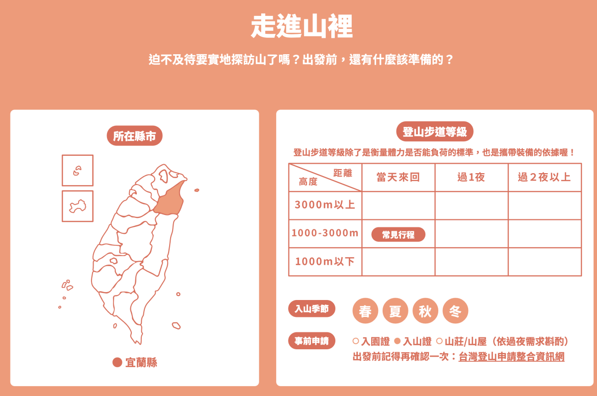 很多愛爬山的人都對於台灣各大名山應該都絲毫不陌生,不過對於登山新手來說,上山前先了解後該座山的特性是相當重要的,就有個網站叫做「山模山樣」,整理了台灣 52 座熱門山的相關資訊,從基本資訊到植物、動物等,還包括有登山裝備建議,讓你可以先做好做滿功課,或者你對於山有興趣的話,也可以透過這網站來了解,裡面用圖解及文字的方式,容易閱讀且跟小朋友一起看的話,我想也更看的下去吧。