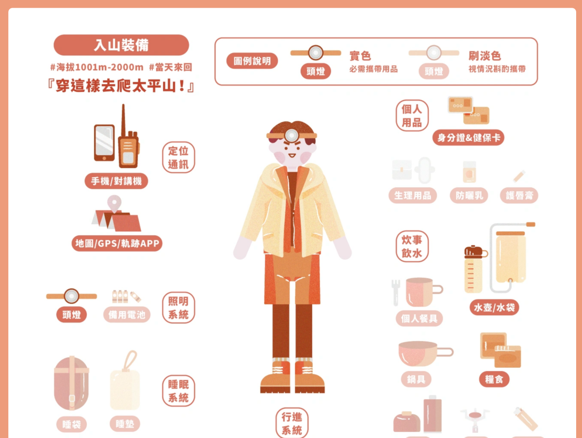最後則是有入山裝備參考,這個相當重要,很多登山新手都是不顧裝備亂衝,結果就在半路找救援了,所以如果你對於登山不熟悉的話,千萬不要隨意的上山,千萬做好準備再去爬,這樣才能確保安全。