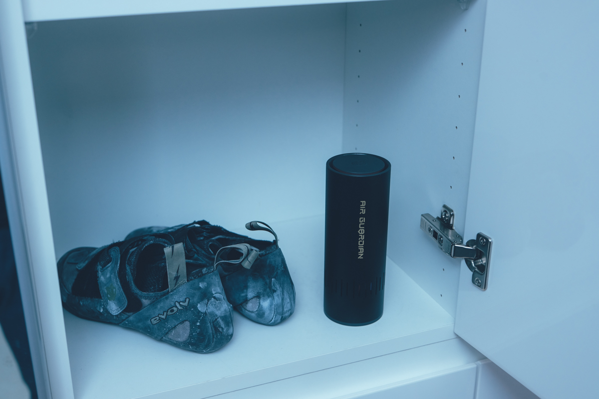 特別是阿湯的攀岩鞋,因為都是沒穿襪子直接穿著,其實很容易因為腳汗造成臭味,鞋內也更容易滋生細菌,所以每次一回家我都會立刻放到鞋櫃獨立一小格,然後再把 Air Guardian 活氧淨菌器放進去,隔天鞋子就又復活了,繼續再戰(因為我攀岩頻率太高了)。