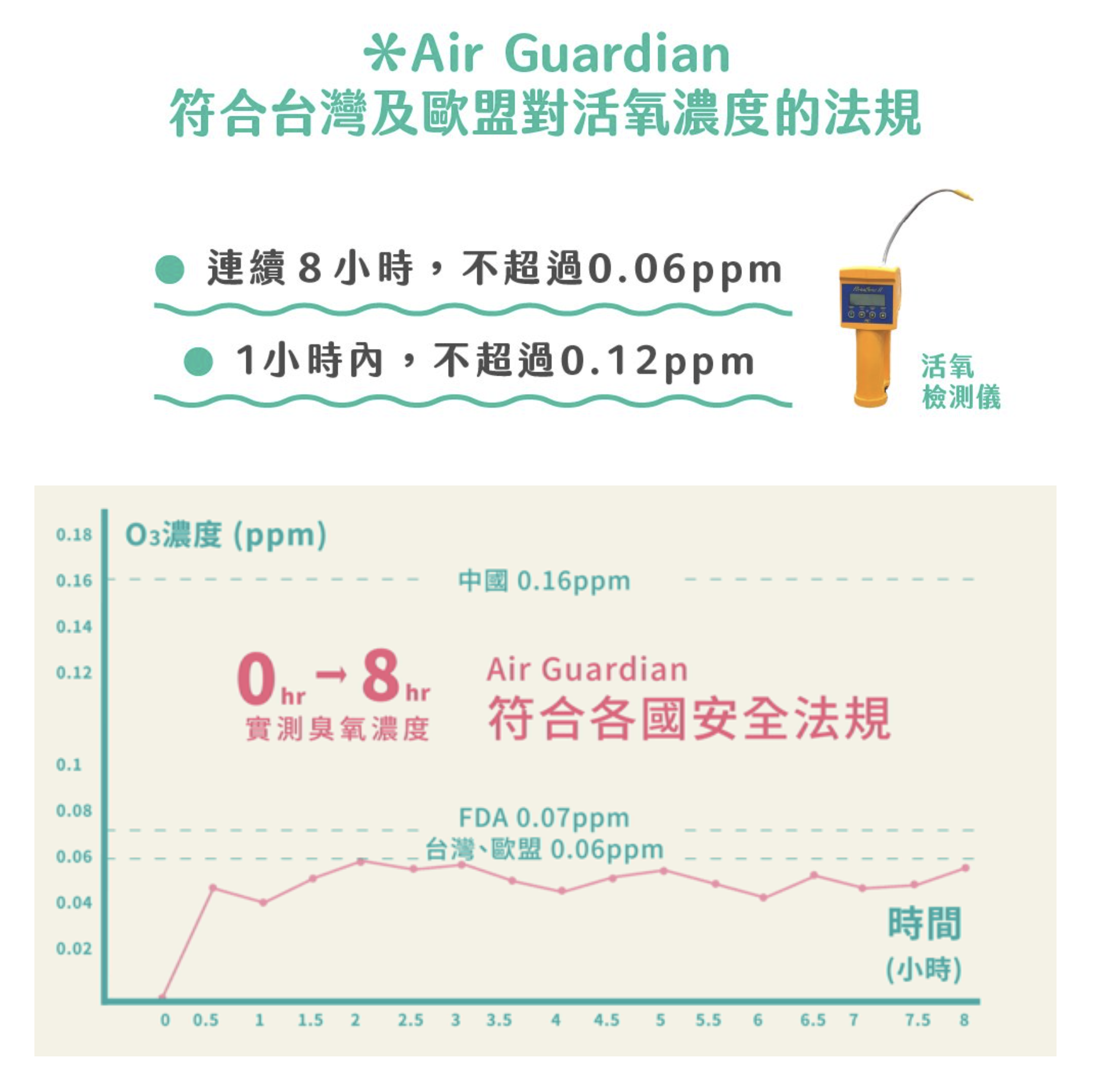 阿湯曾經入手過不少相關於紫外線、臭氧的設備,為的就是抑制細菌生長(特別像是廁所容易生黴菌),其中臭氧對阿湯來說可以用的範圍更廣,不過目前市面上專門的臭氧設備不論大小,在使用時都是不建議「人」處於同一空間,因為濃度會超過安全法規。而今天要分享的 Air Guardian 活氧淨菌器則是目前首款主打可以人機共存一室的臭氧設備,完全是台灣製造生產,符合台灣、歐盟所規範的活氧濃度且經由 SGS 認證的尼古丁、甲醛、細菌去除率,讓你可以真正安心的使用。
