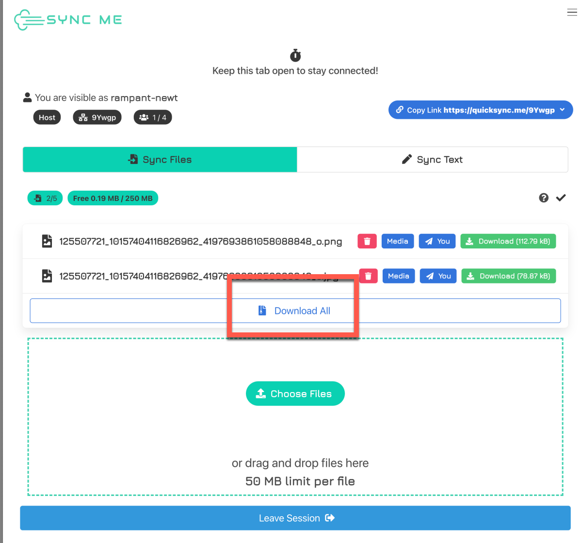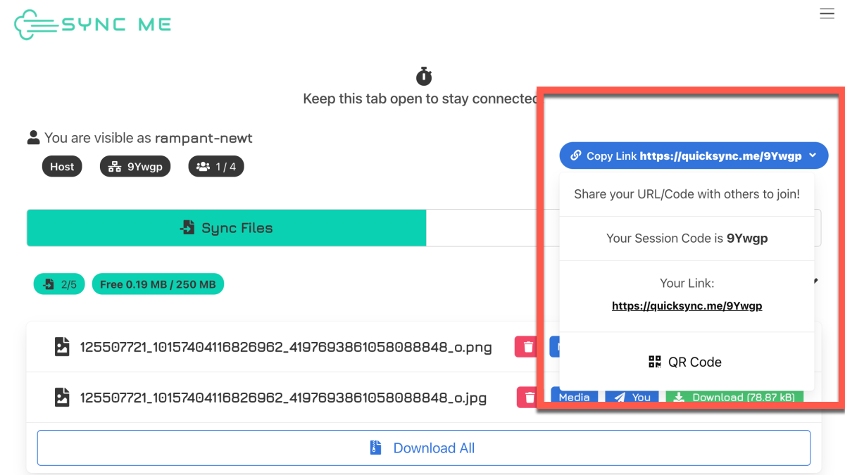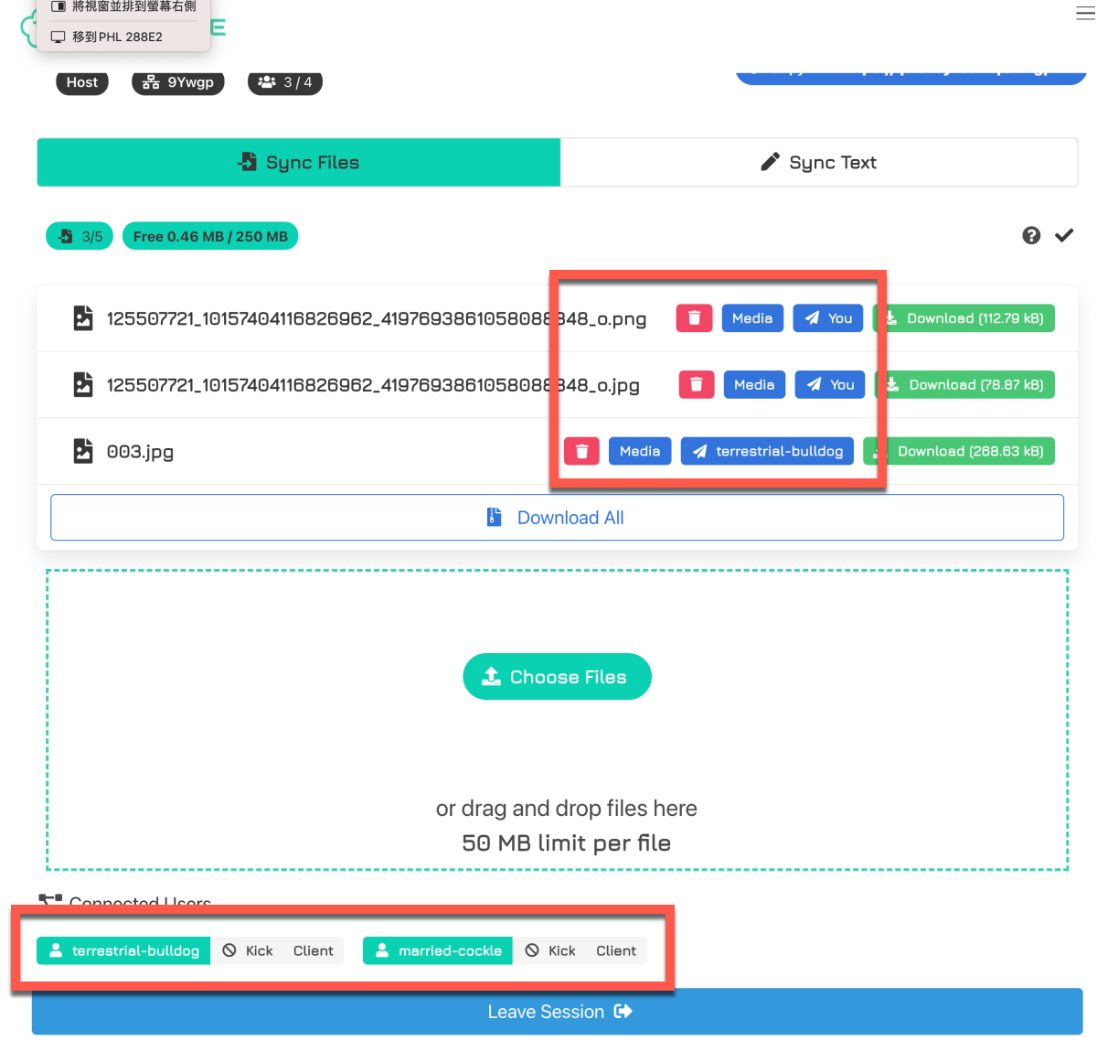 當朋友利用連結進入畫面時,可以繼續分享檔案上來,而且也可以在每個檔案後方看到檔案的區分,可以知道是誰上傳的,也能看到目前有多少人在這頁面上,每個檔案都可以各別選擇下載,也可以一直下載全部。