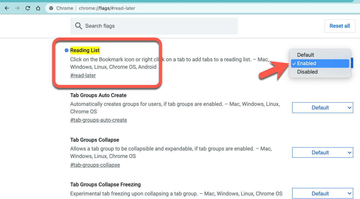 這時應該會停在 Reading List 的選項,請改為 Enabled,然後重新啟動瀏覽器。