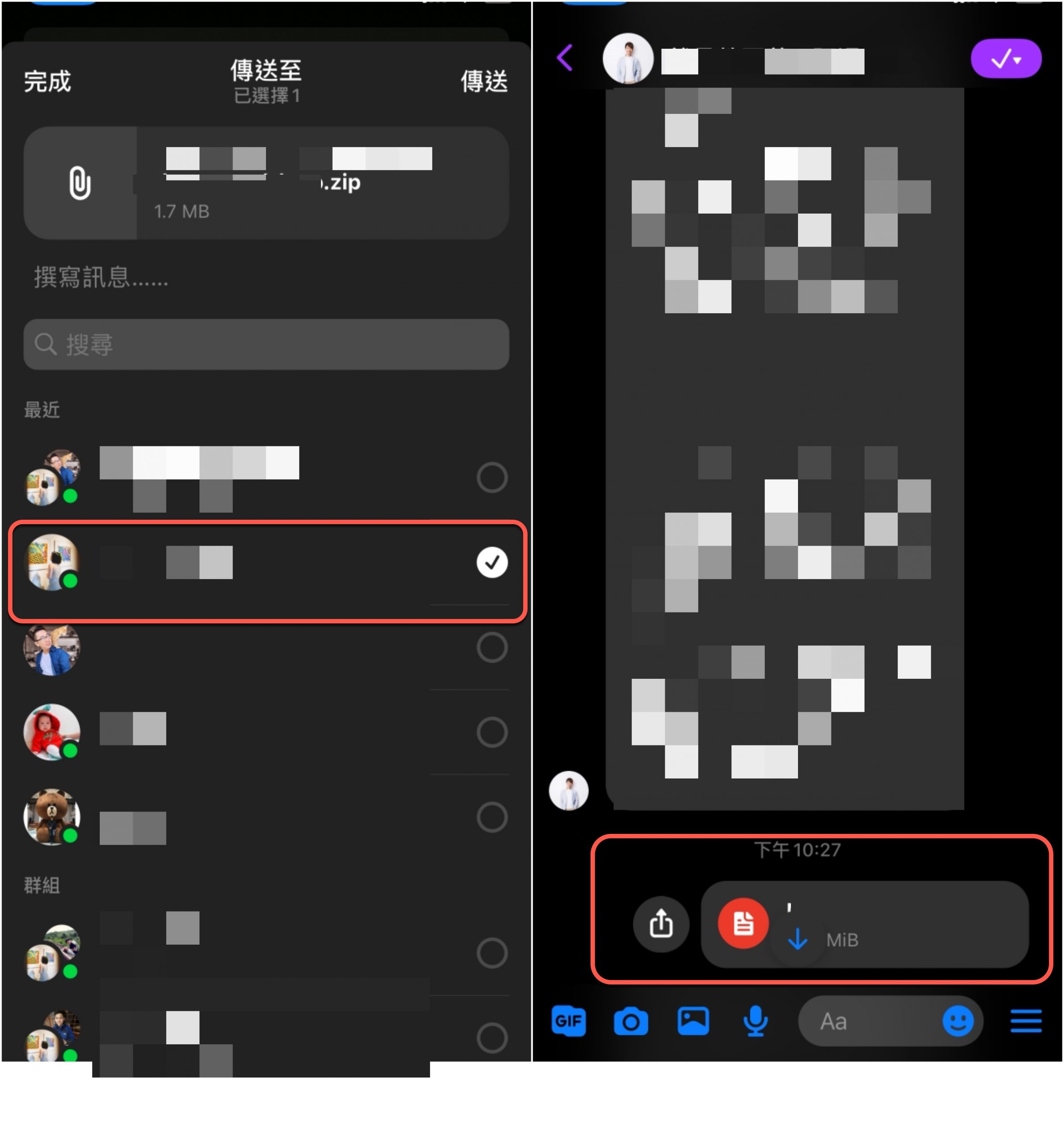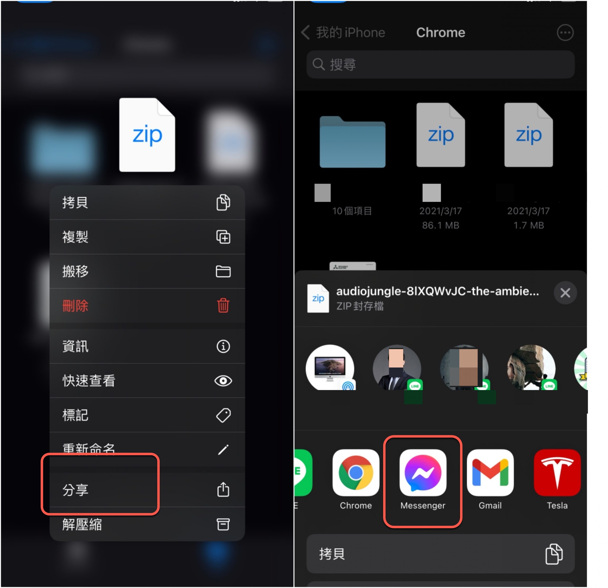 這時,其實只要換個方式,一樣可以傳送檔案,不論是 Android 或 iOS,只要在任意檔案長按後,按分享,就可以選擇分享到 FB Messenger。